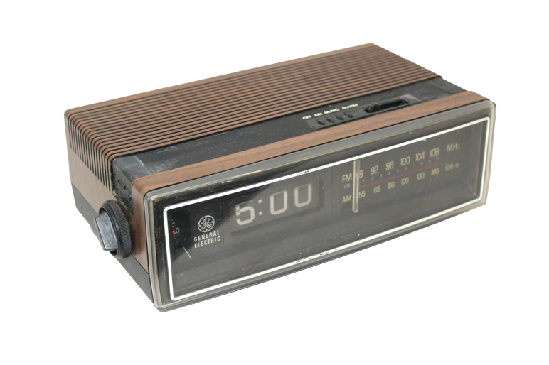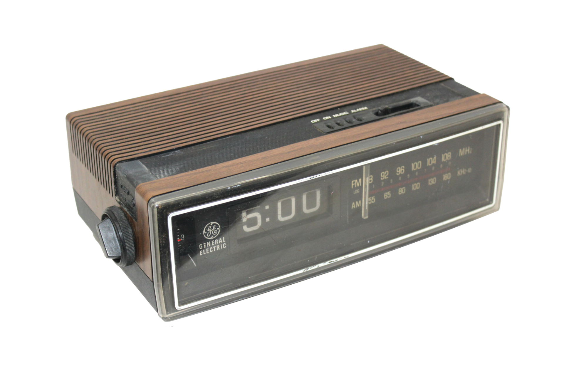 Black and faux wood GE 7-4305C flip alarm clock radio.