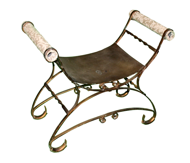 Bronze, painted metal, scrollwork, single person bench with curved seat and beige, brocade covered arms.