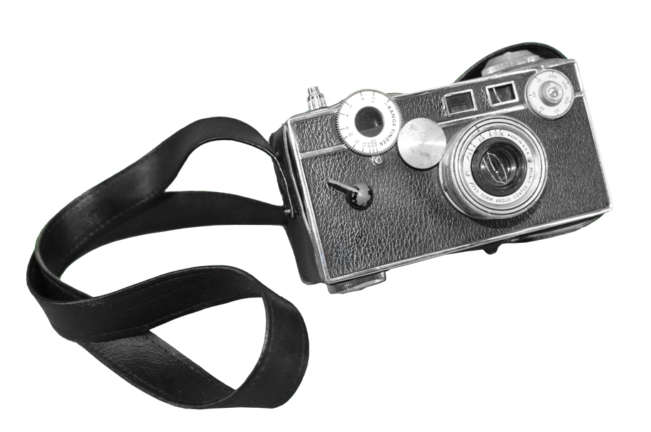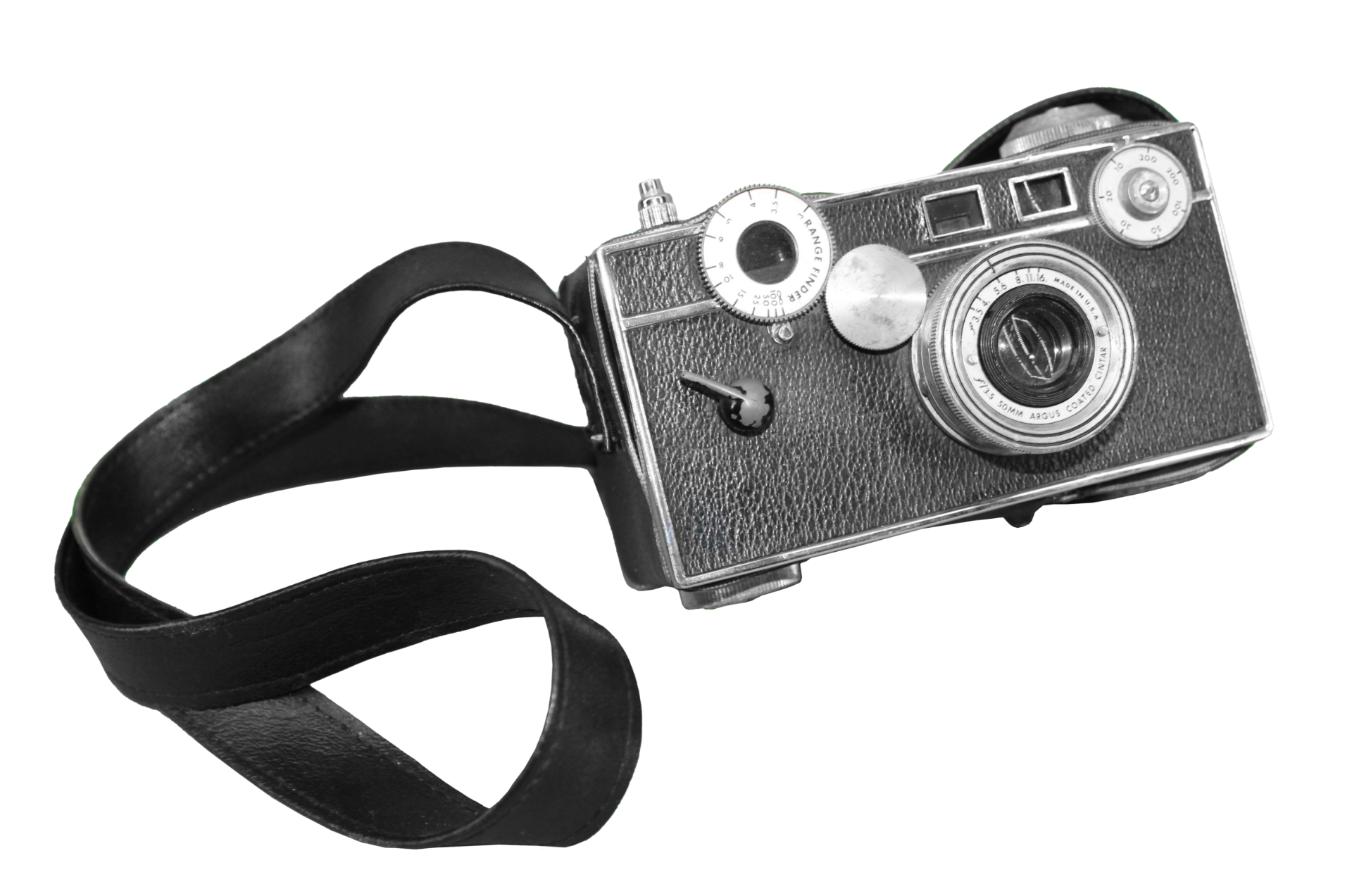 Black and silver Argus C-2 35mm camera with neck strap.