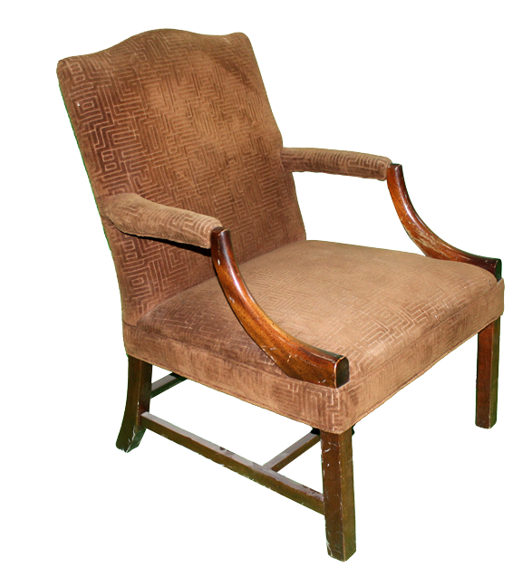 Wooden armchair with brown, raised velvet, maze pattern upholstery.