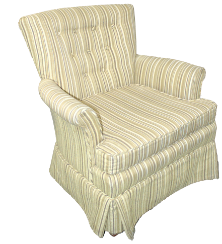 Tan/beige/cream, vertically striped, fabric upholstered armchair with tufted inside back and skirting.
