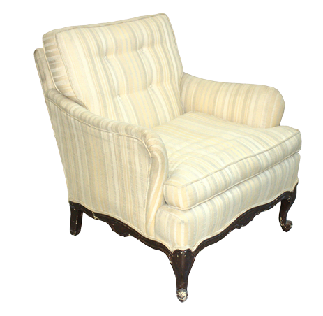 Beige/off white, vertically striped, fabric upholstered armchair with four center tufts on the inside back and carved wood trim.