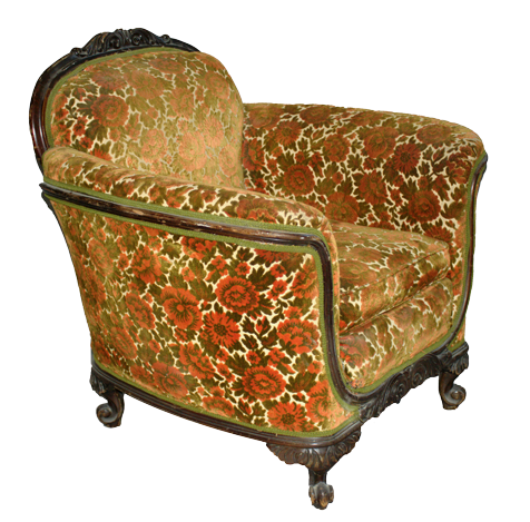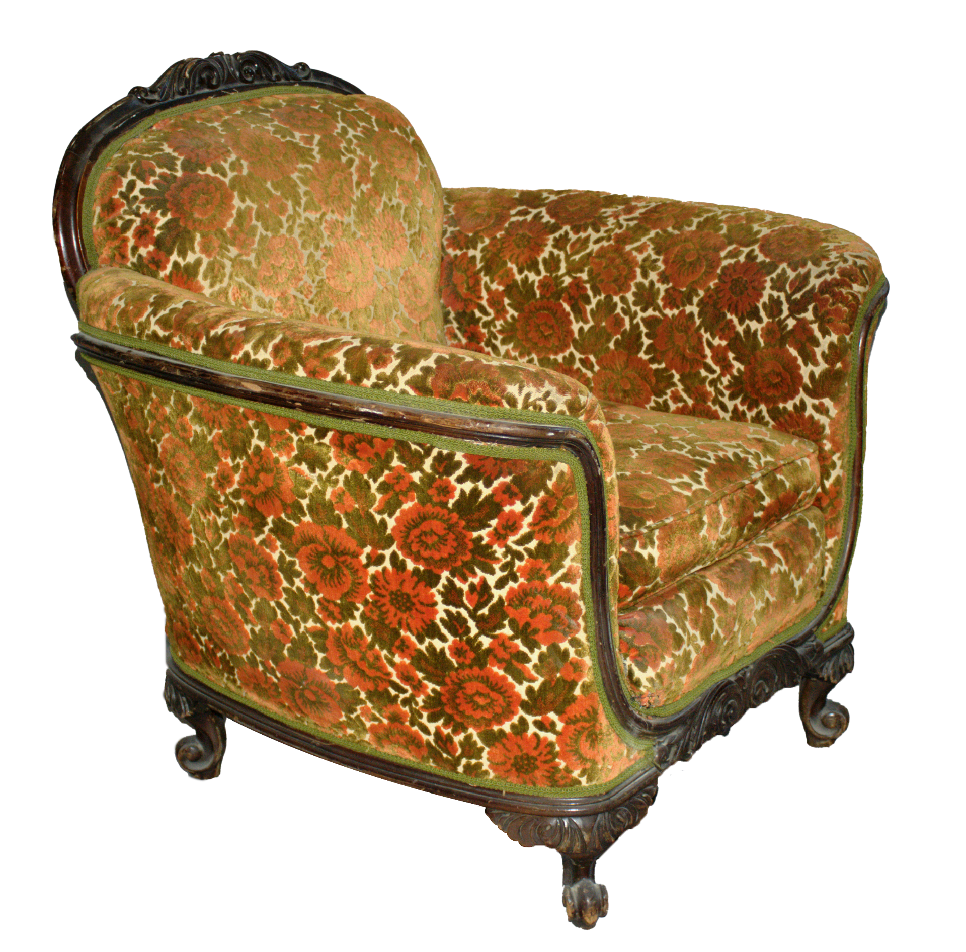 Orange/tan, floral pattern, velvet upholstered armchair with carved wood trim.