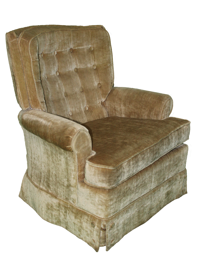 Tan, iridescent, velvet upholstered, swivel arm chair with tufted inside back and skirting with buttons.