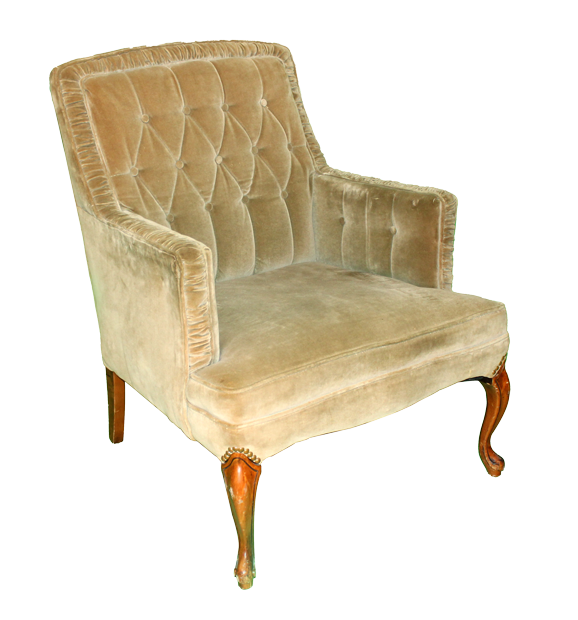 Pale, olive green, velvet upholstered armchair with wooden legs, ruffle trim and tufted inside back and arms.