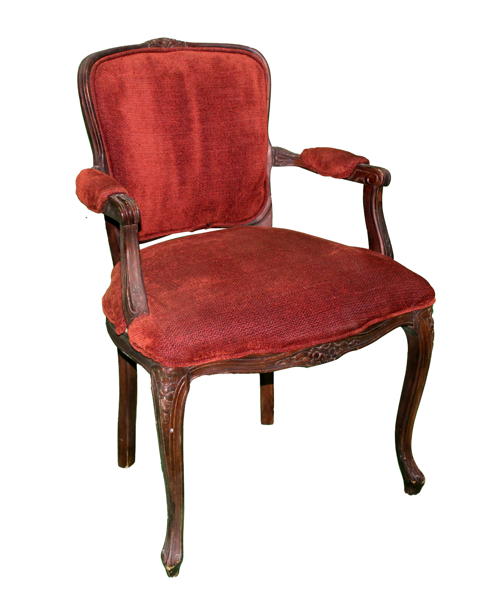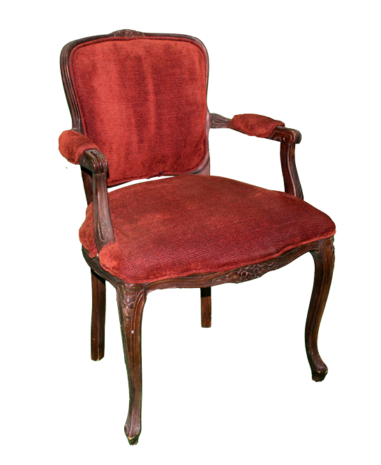 Wooden armchair with rust colored fabric upholstery and carved flower detail.