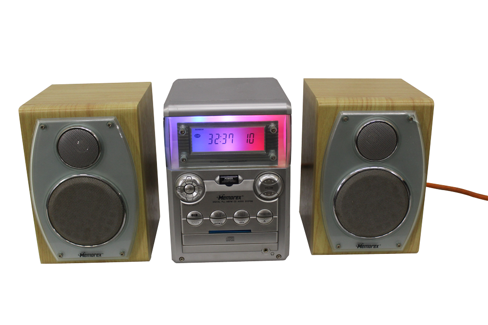 Silver Memorex MX4302 digital home audio system with CD player, AM/FM radio, lighted color changing face plate, detached power cord and two light wood tone speakers.