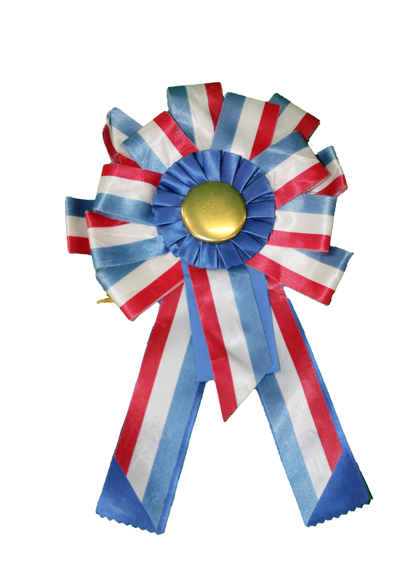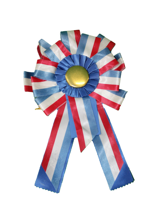 Red/white/blue, circle award ribbon with gold center and three tails.