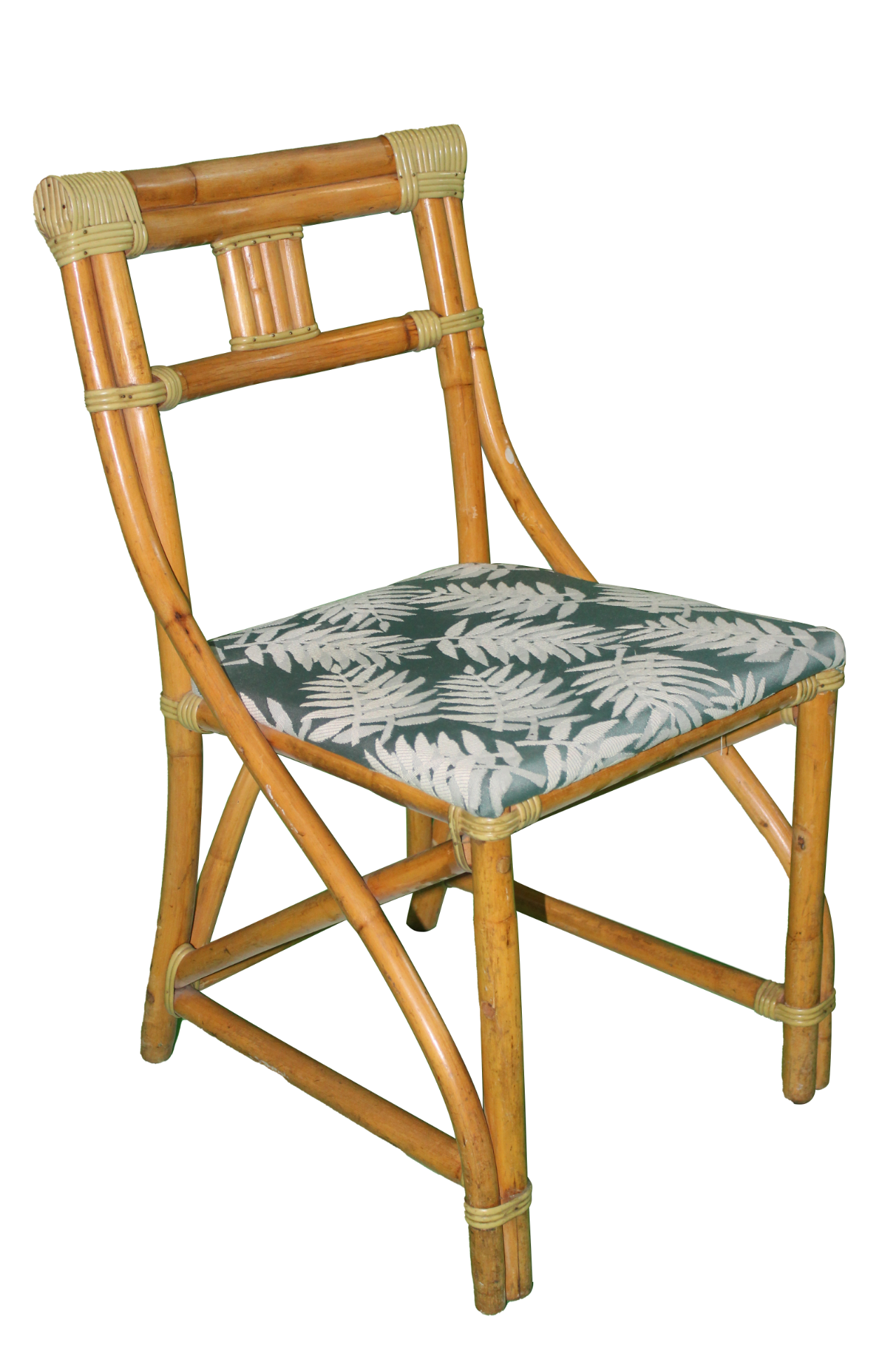 Light brown, bamboo side chair with forest green/white, leaf pattern, fabric seat.