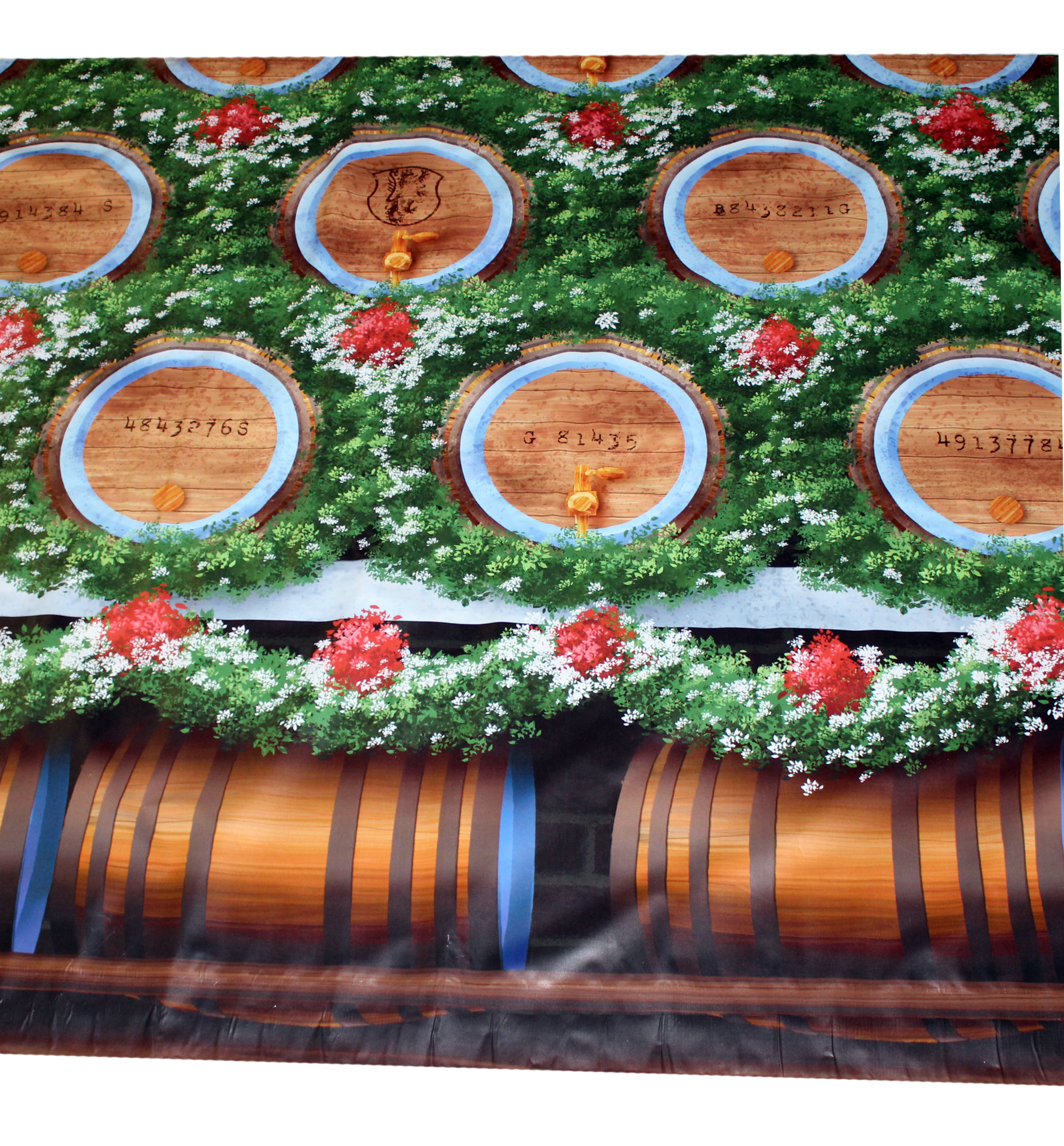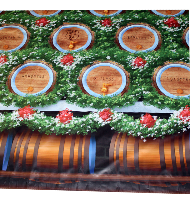 238" x 95" printed vinyl backdrop of an Oktoberfest beer barrel wall surrounded by foliage.