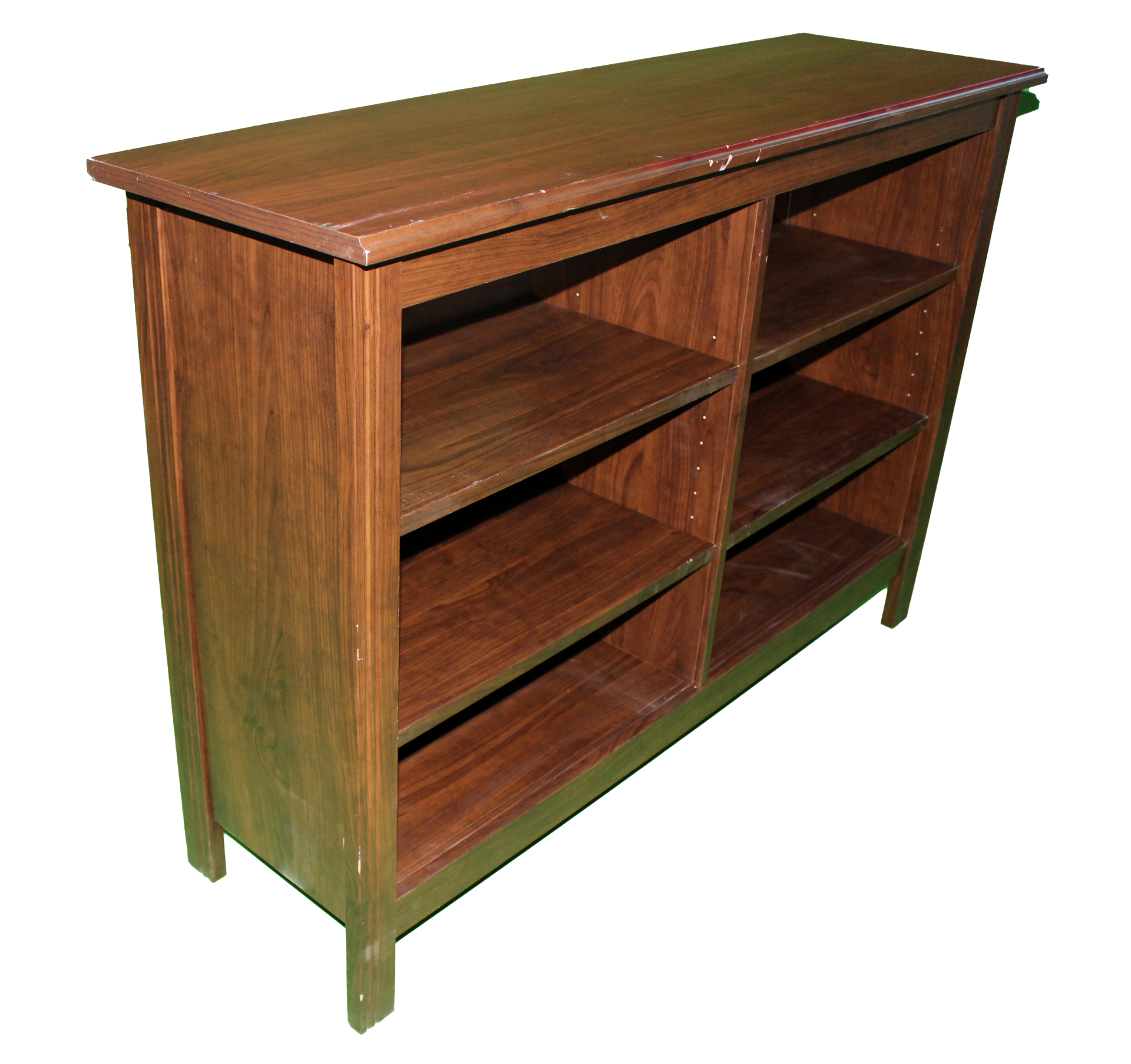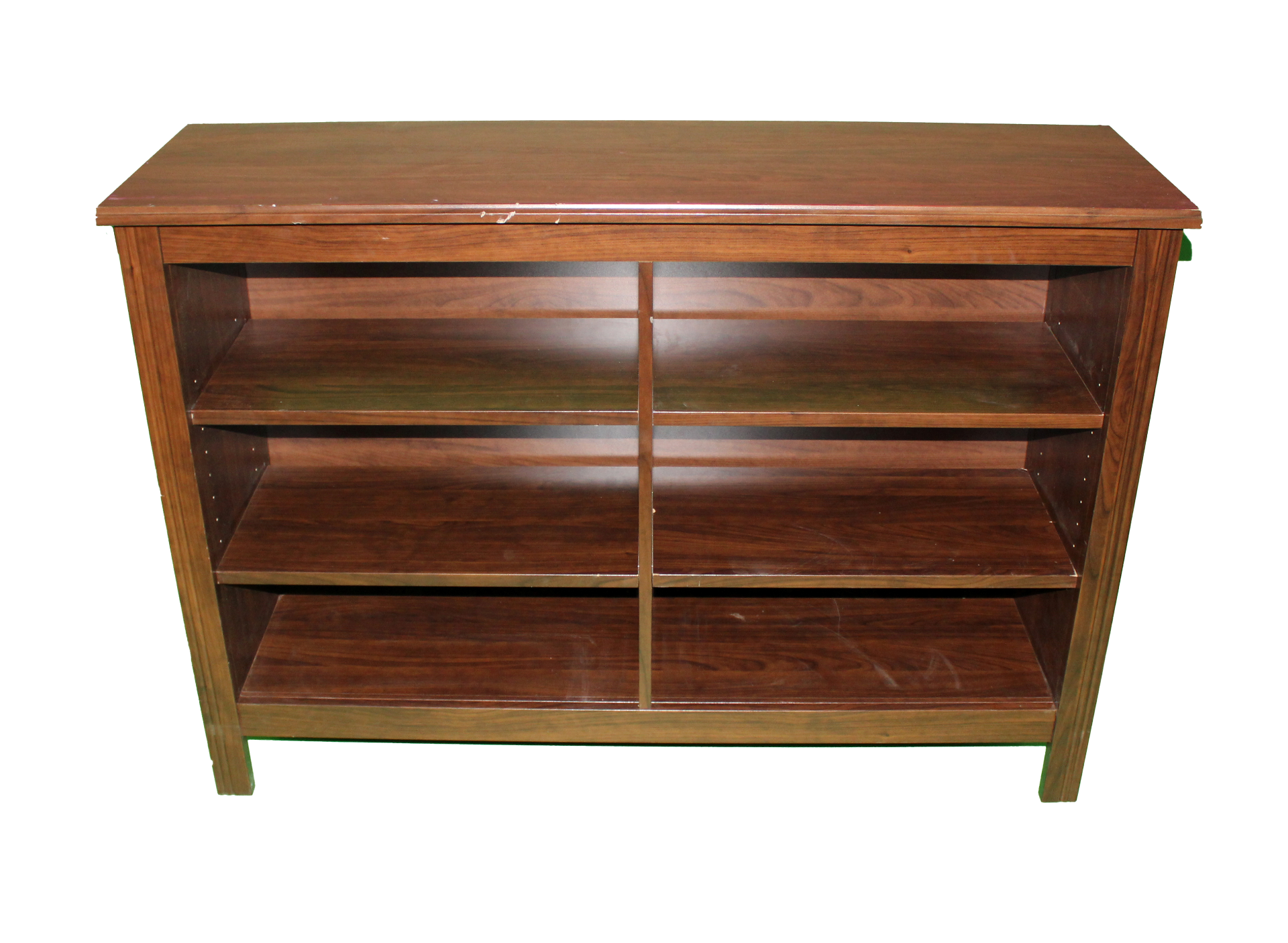 Dark brown, wooden horizontal bookcase with legs and four adjustable shelves.