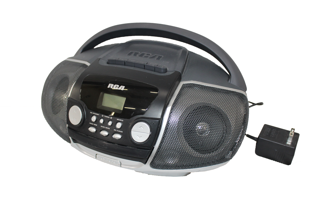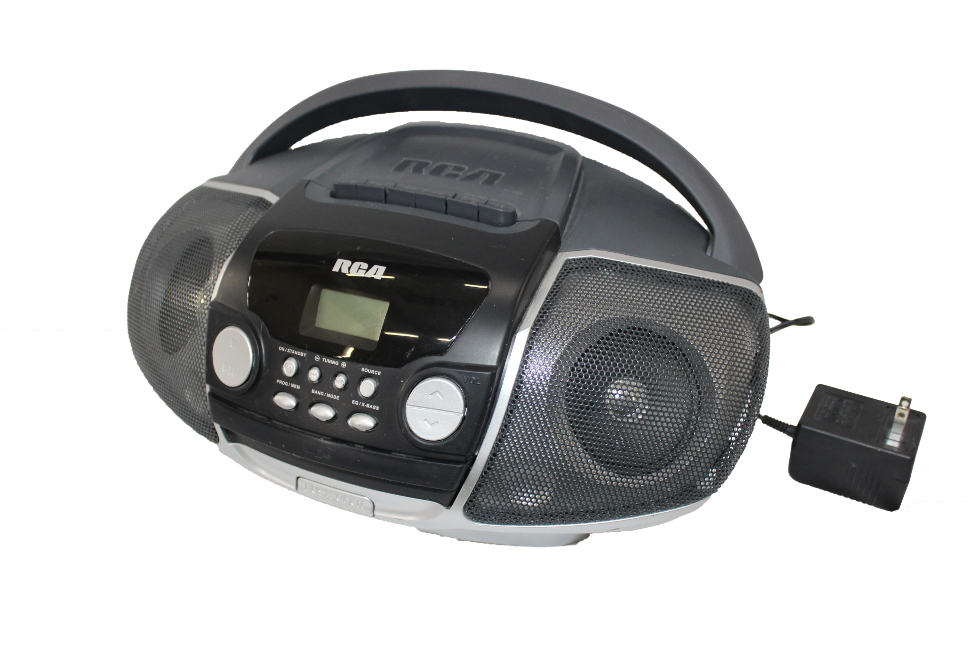 Silver, black and grey RCA RCD175 portable boombox CD player with AM/FM digital tuner and cassette recorder, handle, and detached power cord.