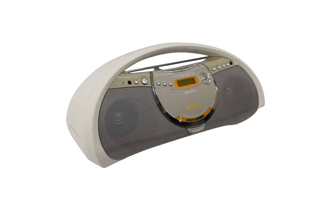 White, beige and orange Sony PSYC ZS-YN7 portable boombox CD player with AM/FM digital tuner, handle, antenna and detached power cord.