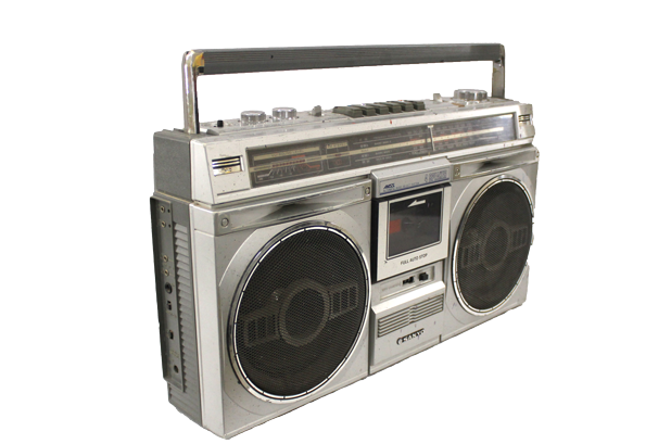 Silver and black Sanyo M9935K portable boombox AM/FM radio with cassette recorder, handle, antenna and attached power cord.