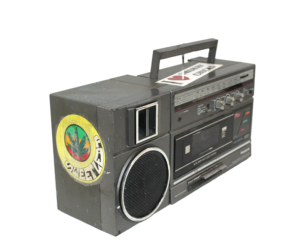 Black and silver Panasonic RX-C37 portable boombox AM/FM cassette recorder with handle, antenna and a cannabis leaf sticker with the phrase "Sweet Leaf" in bubble letters located on the left side and a white sticker with the phrase "I (heart) smokin' chicks" located on the top.