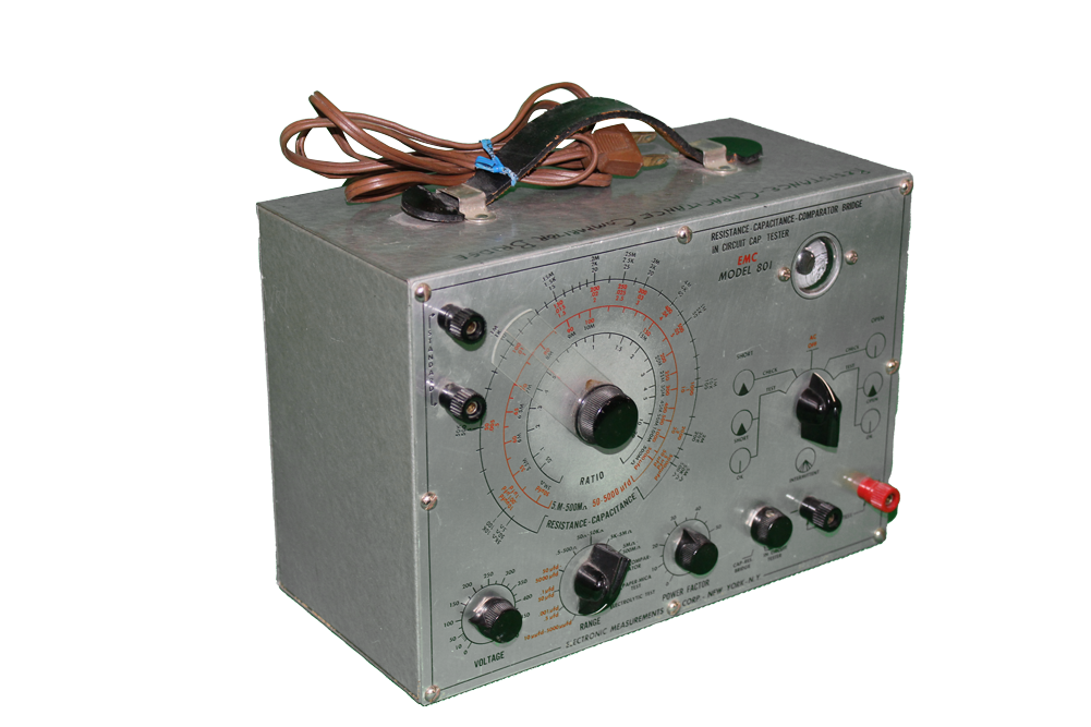 Grey, metal EMC 801 resistance, capacitance, comparator bridge tester with leather handle.