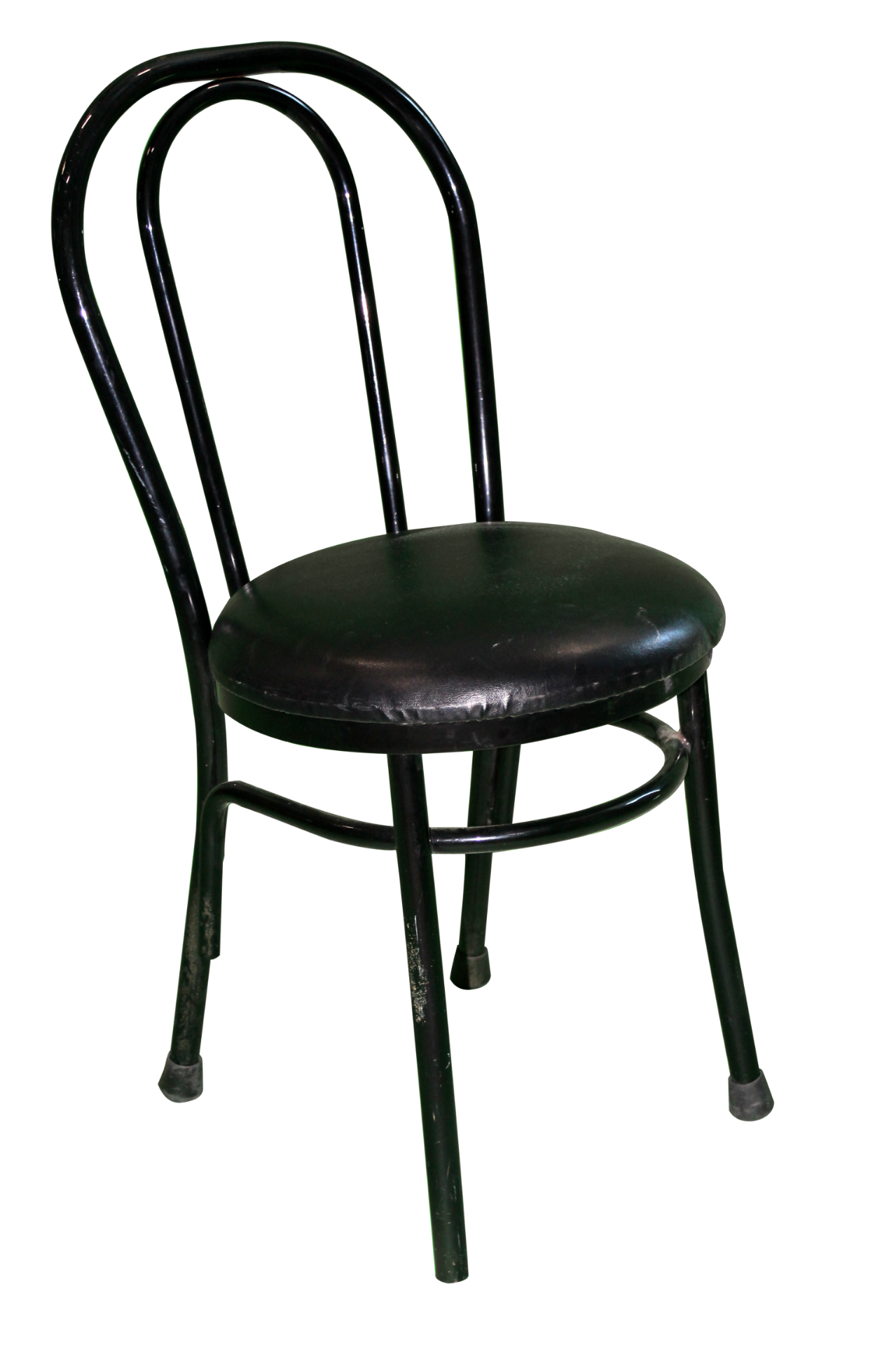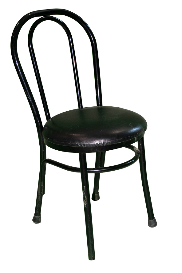 Black, metal cabaret chair with black, vinyl seat cushion.