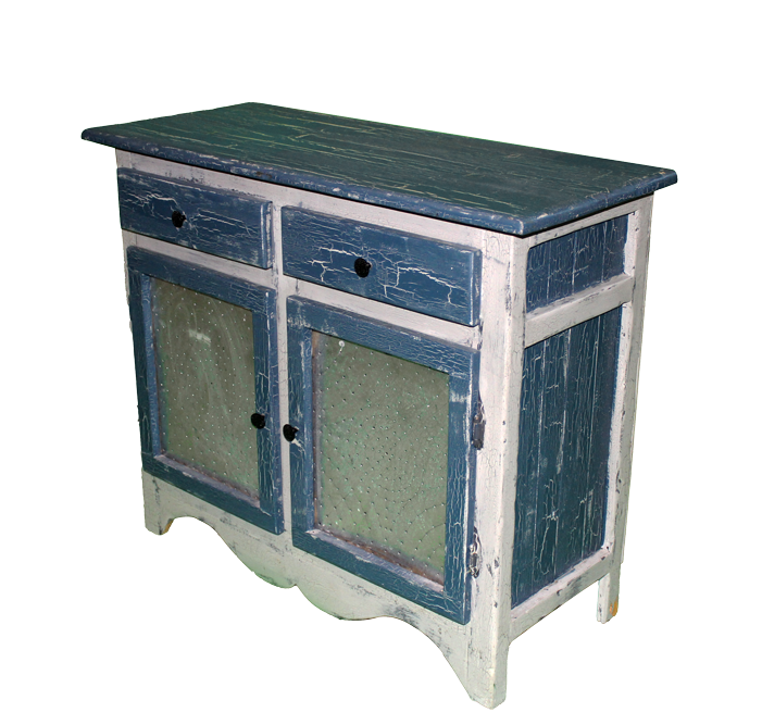 Grey and blue, wooden, cabinet table with cracked paint effect, two top drawers and two bottom doors with metal backing and black knobs.
