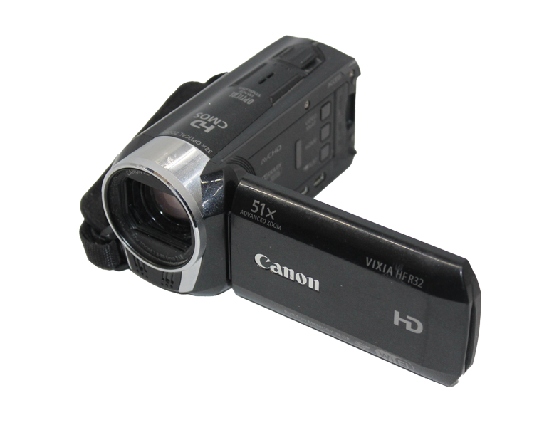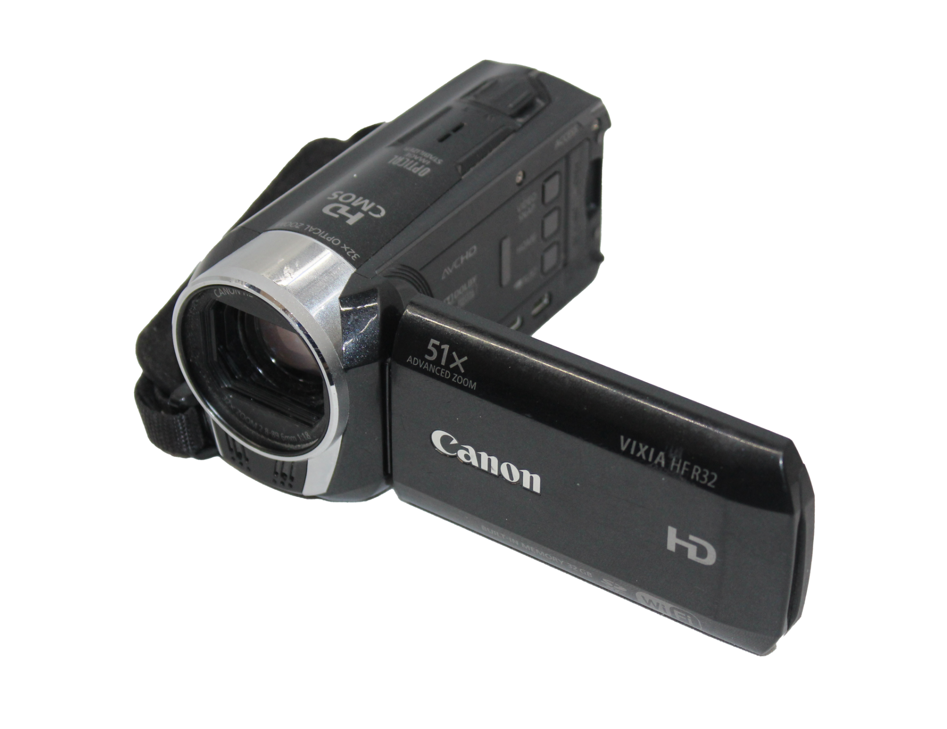 Black and silver Canon Vixia HF R32 video camera with grip belt.