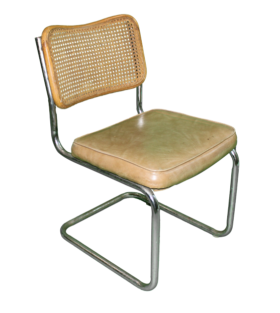 Metal, cantilever chair with tan, vinyl seat cushion and cane back.