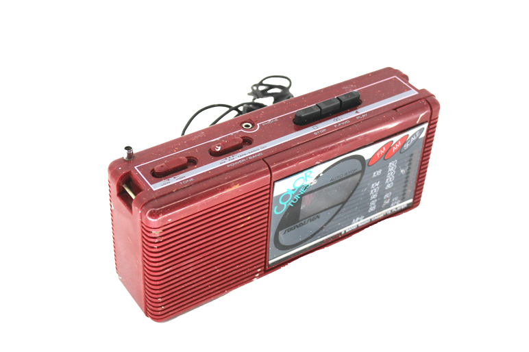 Burgundy Soundesign Color Tunes 4603 radio cassette player with detached power cord.