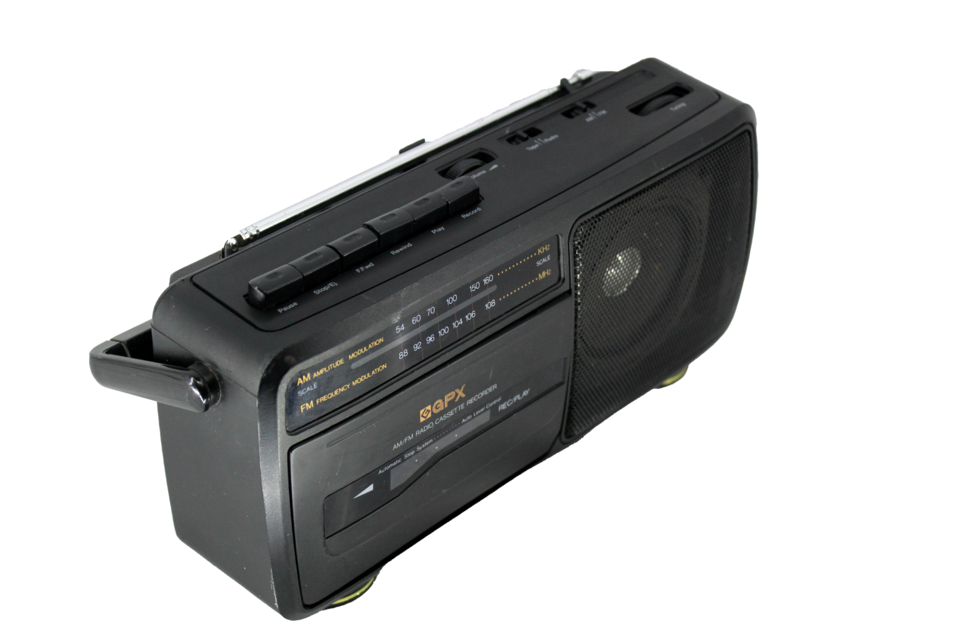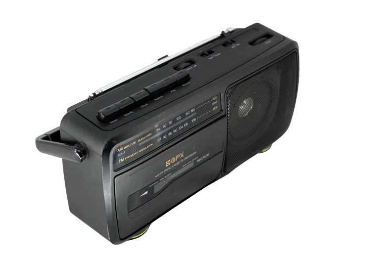Black GPX C728 radio cassette player with antenna, handle and detached power cord.