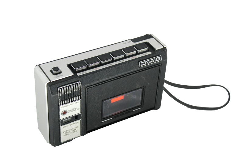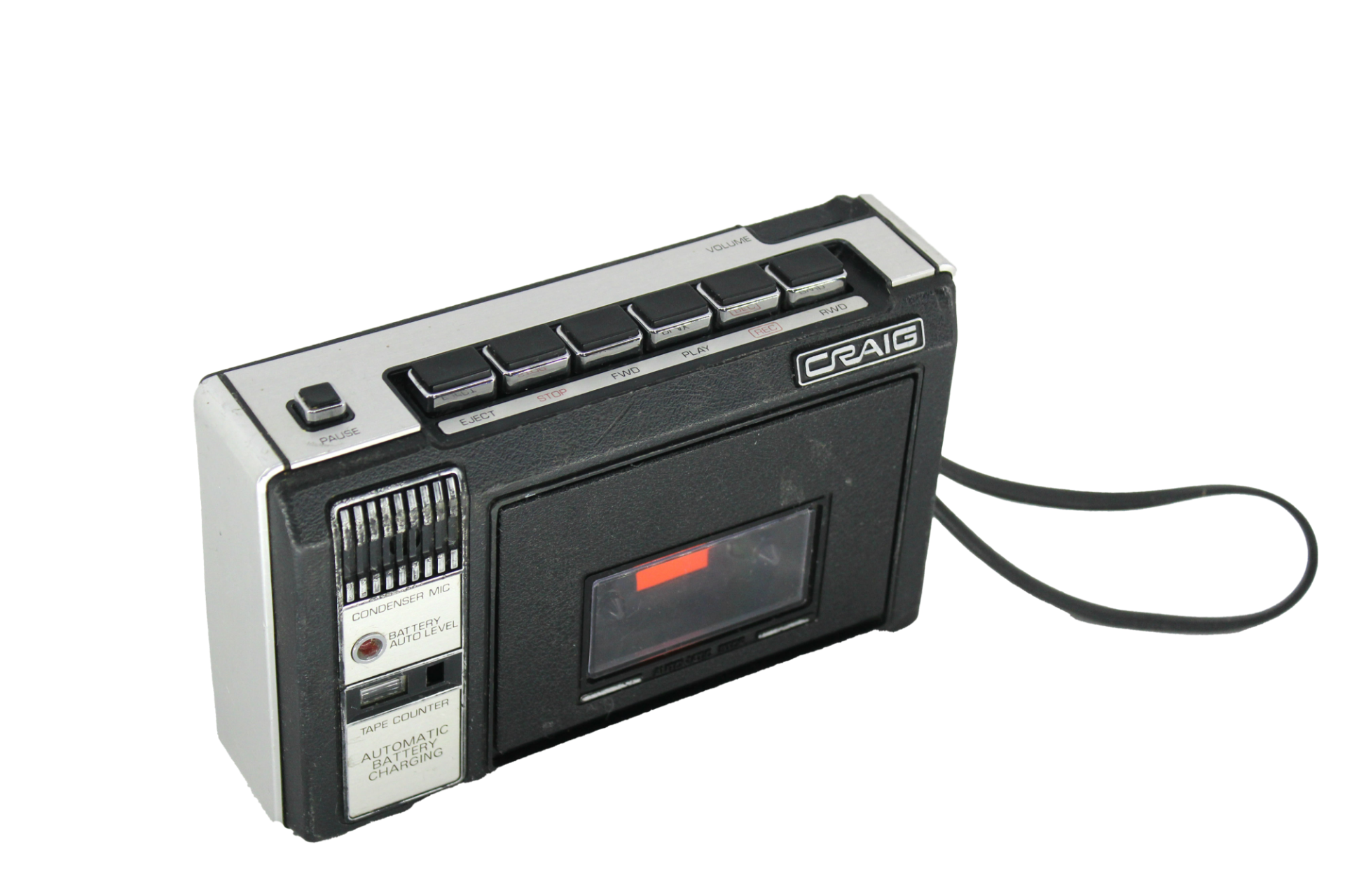 Black and silver Craig 2629 cassette recorder with wrist strap with detached power cord.