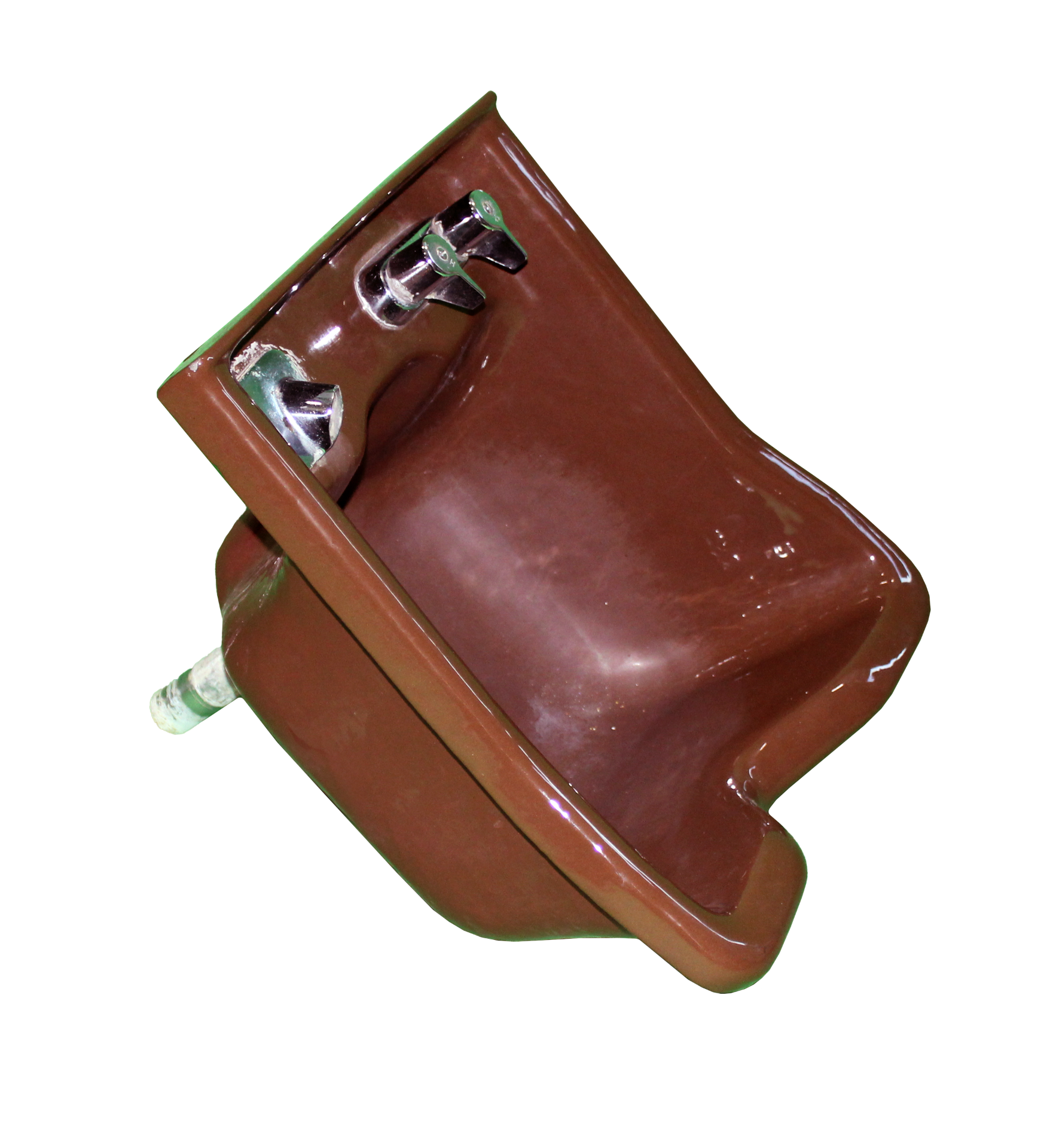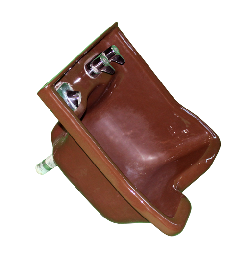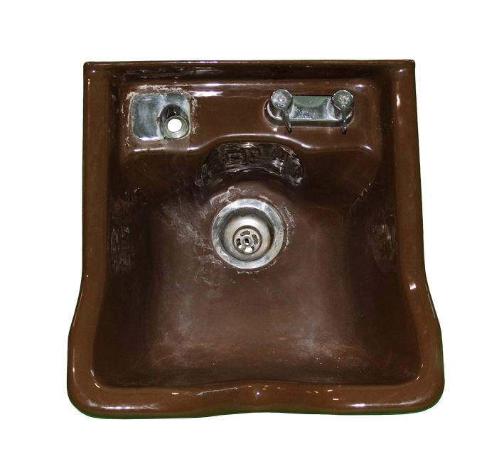 Brown, cast iron/porcelain, hair salon sink with double handle faucet.