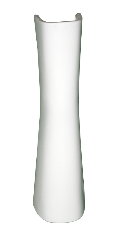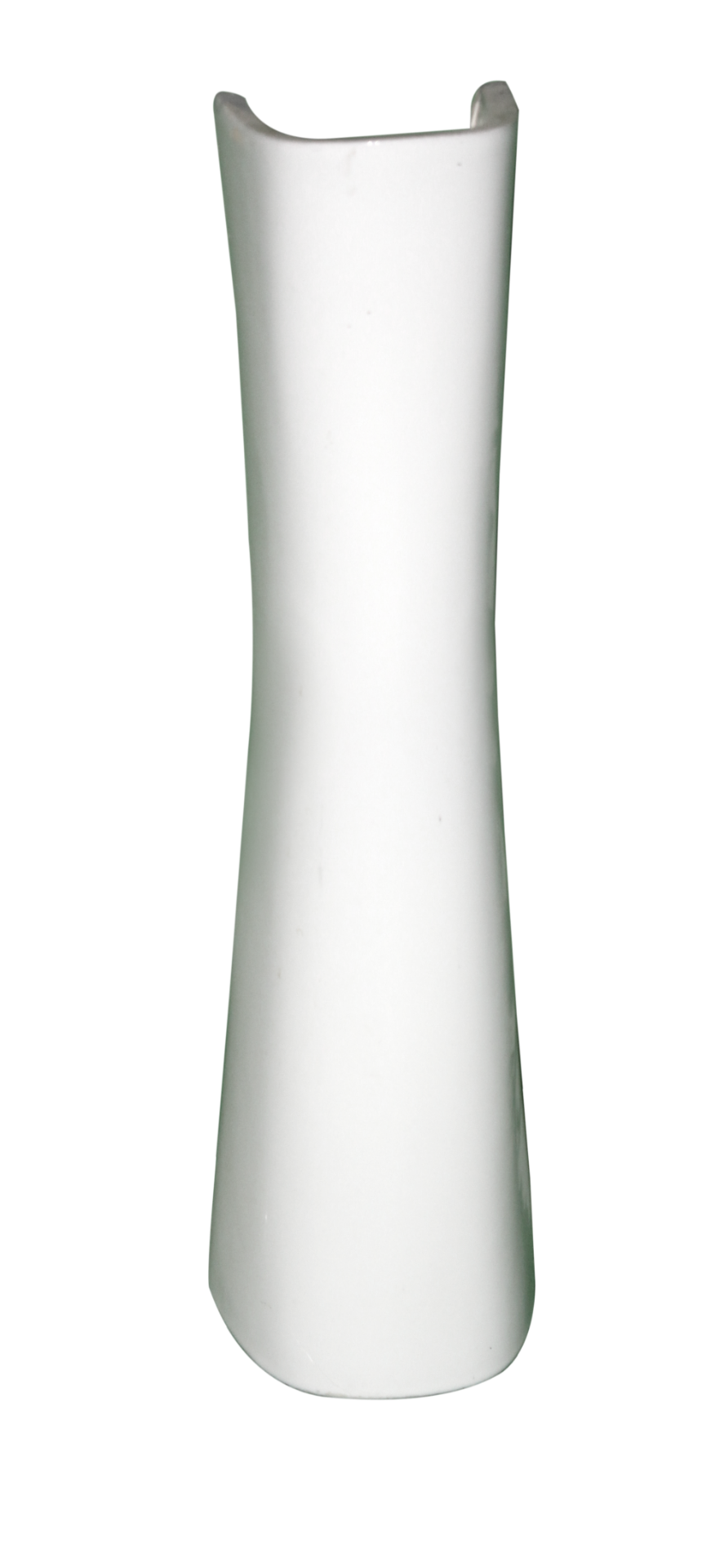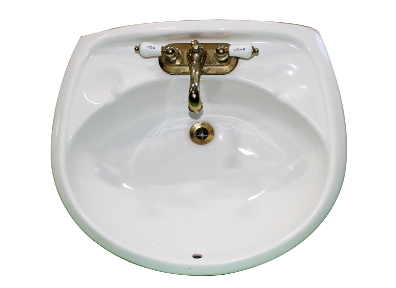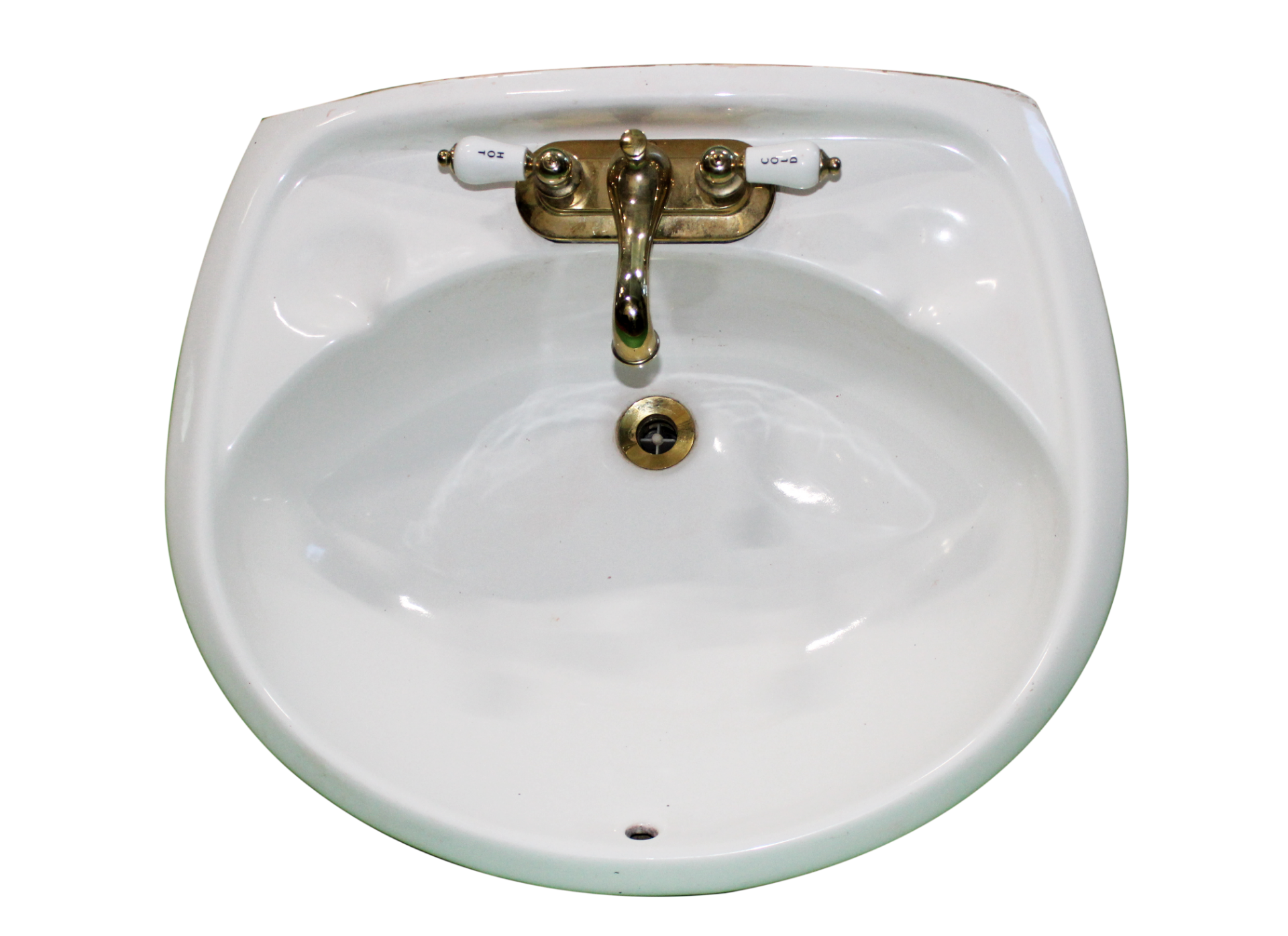 White, cast iron/porcelain, bathroom sink with gold, double handle faucet and drain, attached hose and separate, porcelain pedestal.