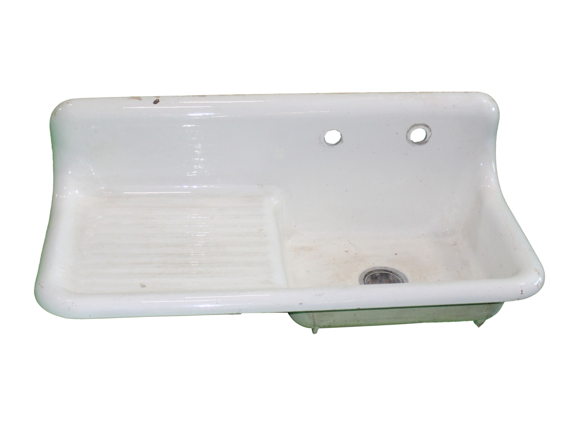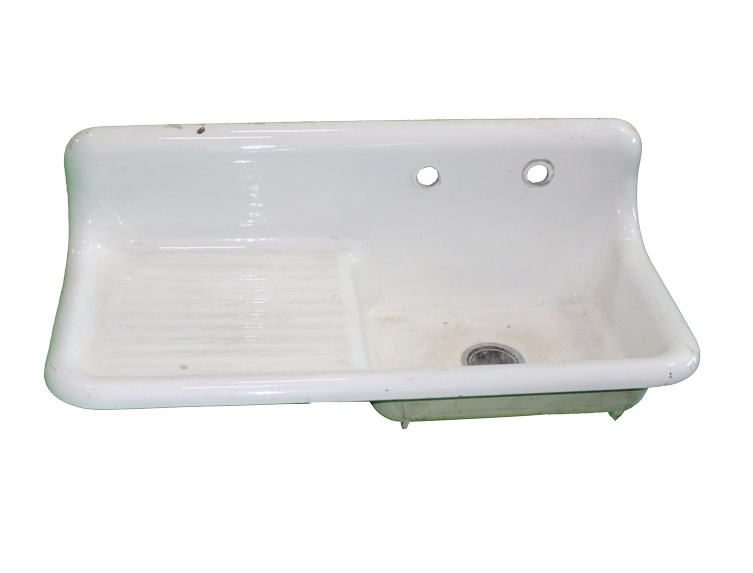 White, cast iron/porcelain, single basin utility sink with left hand side drainboard.