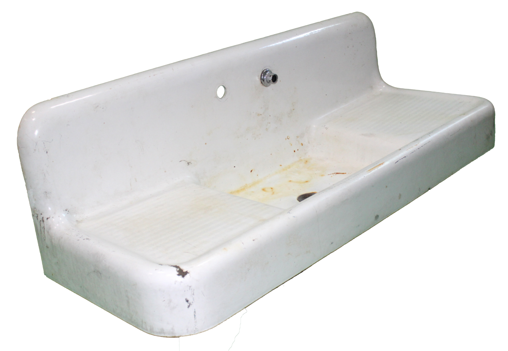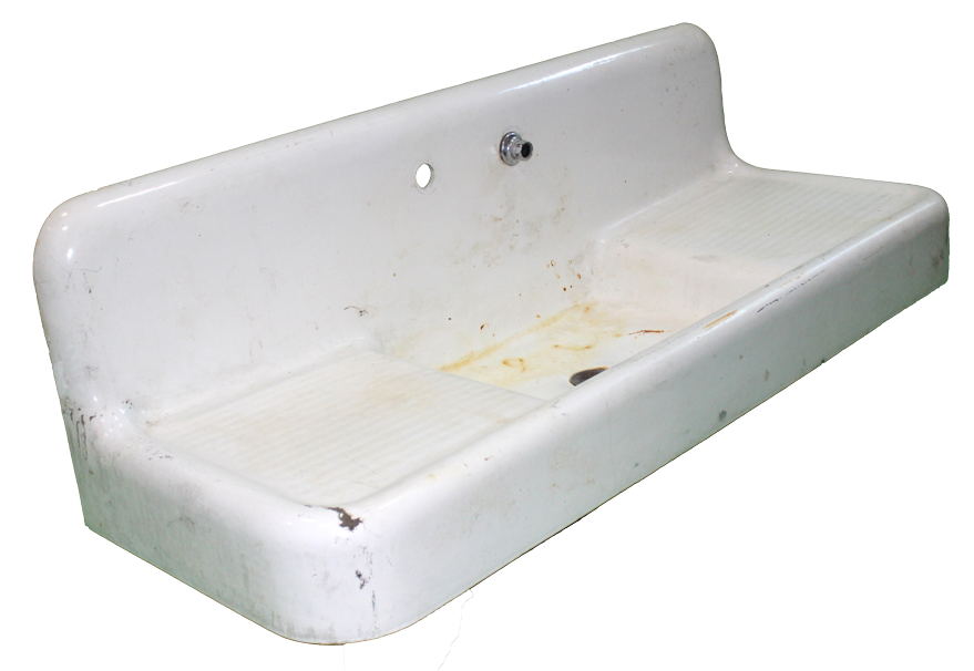 White, cast iron/porcelain, single basin utility sink with double drainboard.