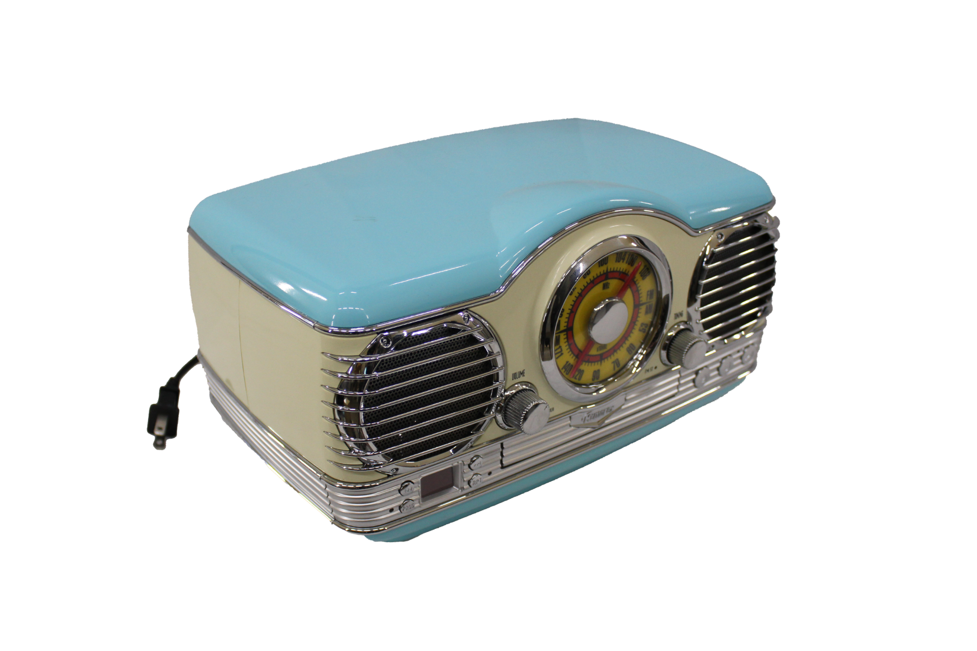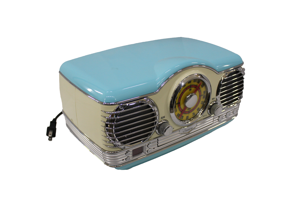 Turquoise, 1950s design, Memorex MTT3200 nostalgic CD player and AM/FM radio with attached power cord.