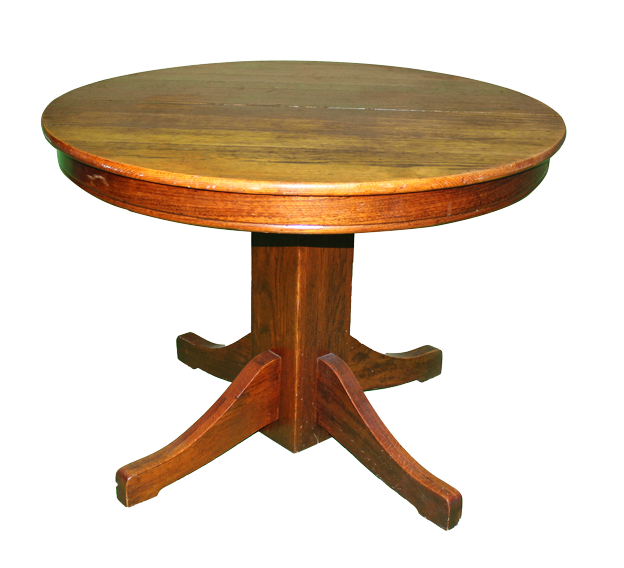 Brown, wooden, circular center table with square, pedestal base and four protruding legs.