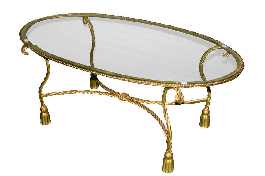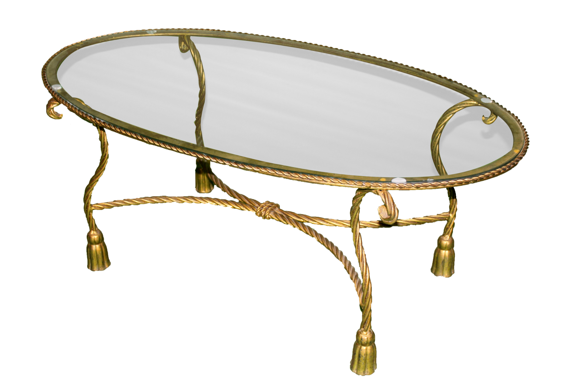 Gold, metal, rope shaped, oval coffee table with tassle feet and glass top.