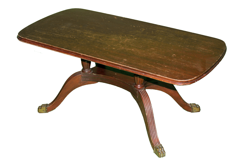 Red/brown, wooden, rectangular coffee table with rounded corners, turned supports, brass feet and stretcher.