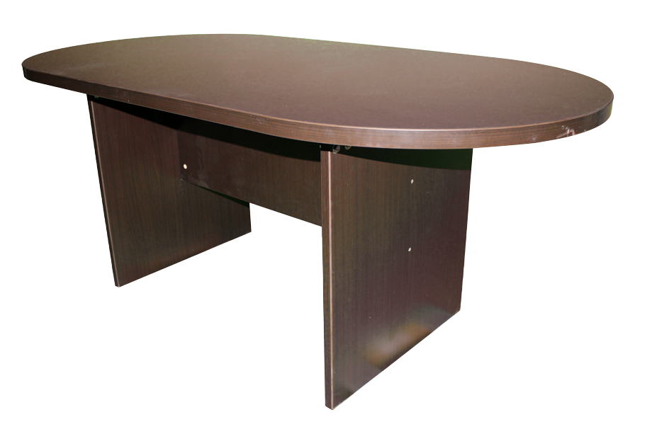 Dark brown, wooden, oval conference table with laminate wood grain covering.