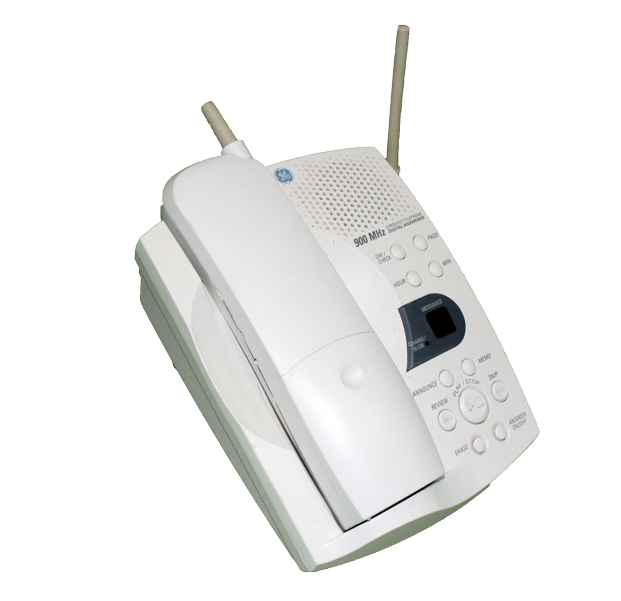White GE 26990GE1-A cordless telephone with digital answering machine, wall mount, and antenna.