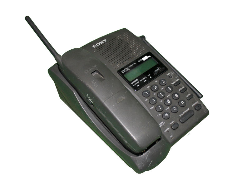 Dark grey Sony SPP-ID975 cordless telephone with wall mount and antenna.