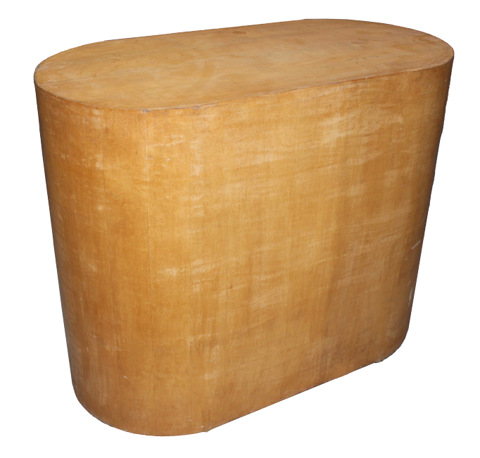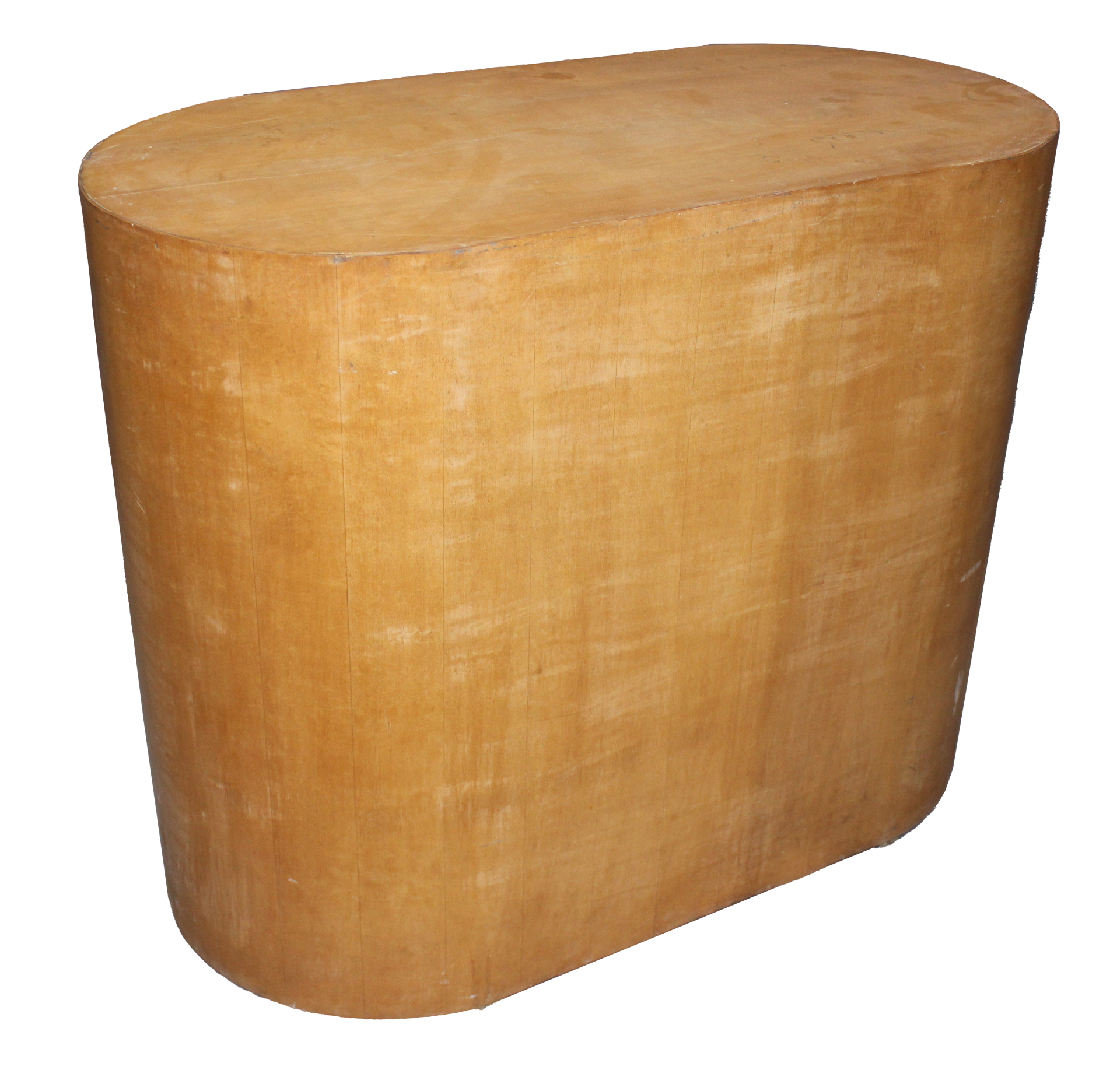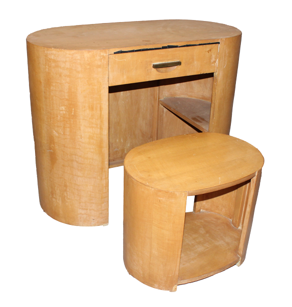 Light wood tone, oval shaped desk with rounded sides, single drawer and matching seat.