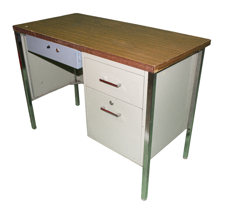 Beige, metal desk with right side drawers, grey, center cash drawer and wooden, rectangular top.