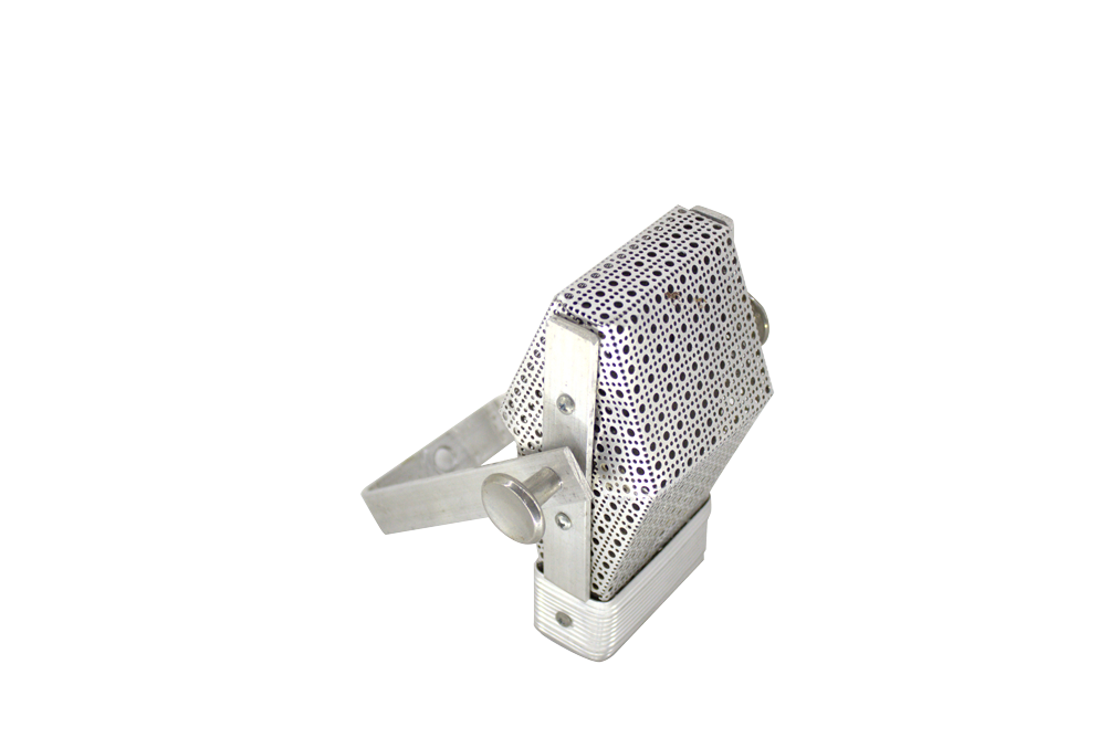 Vintage, aluminum microphone with perforated, diamond shaped shell.