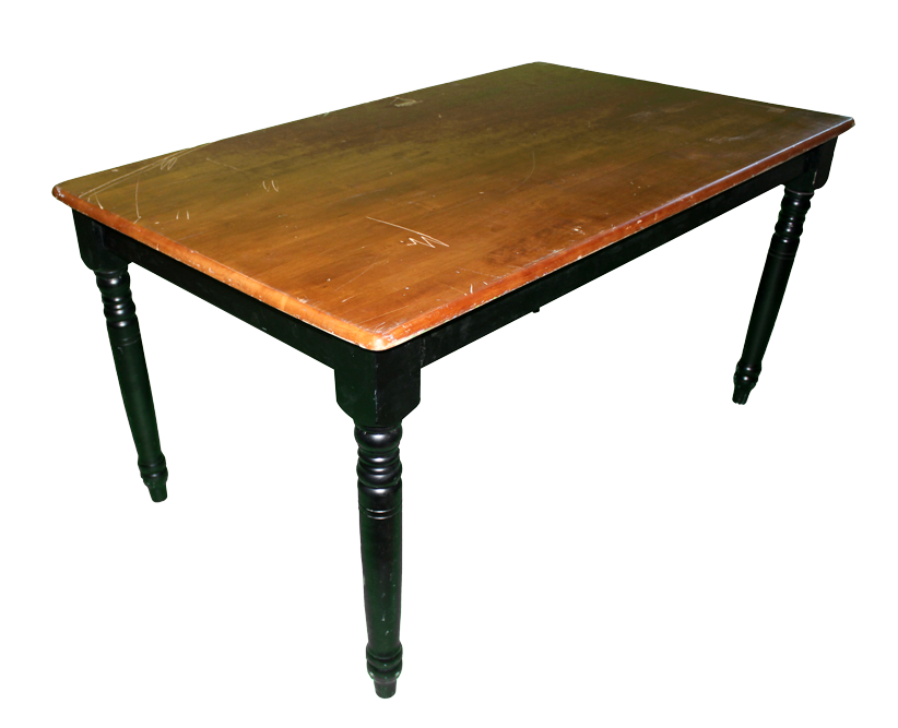 Wooden, rectangular dining table with light brown top and black turned legs.