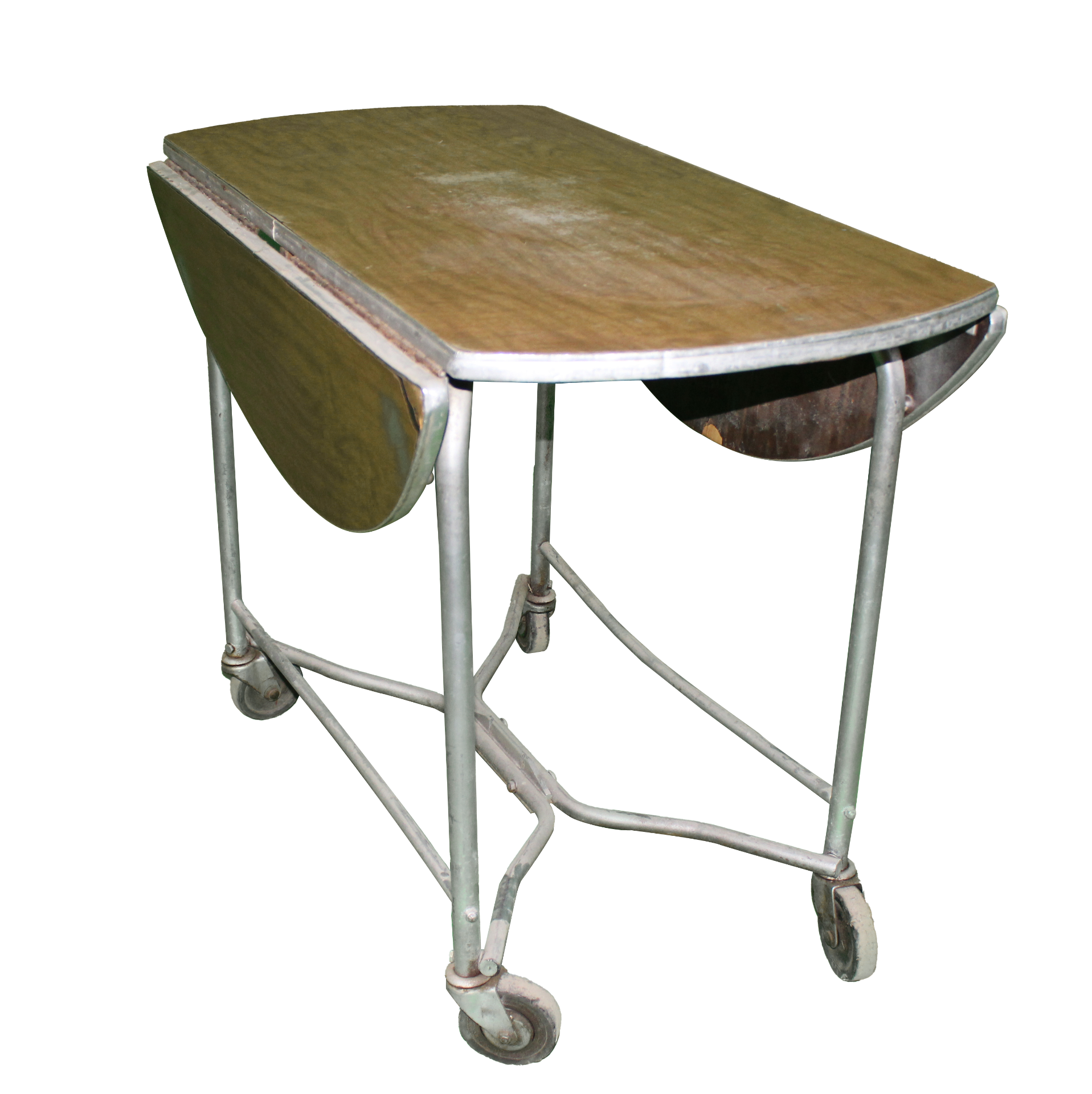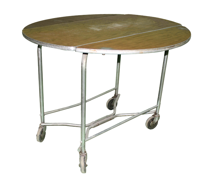 Circular, metal, distressed, rolling drop leaf work table with wood and veneer top.