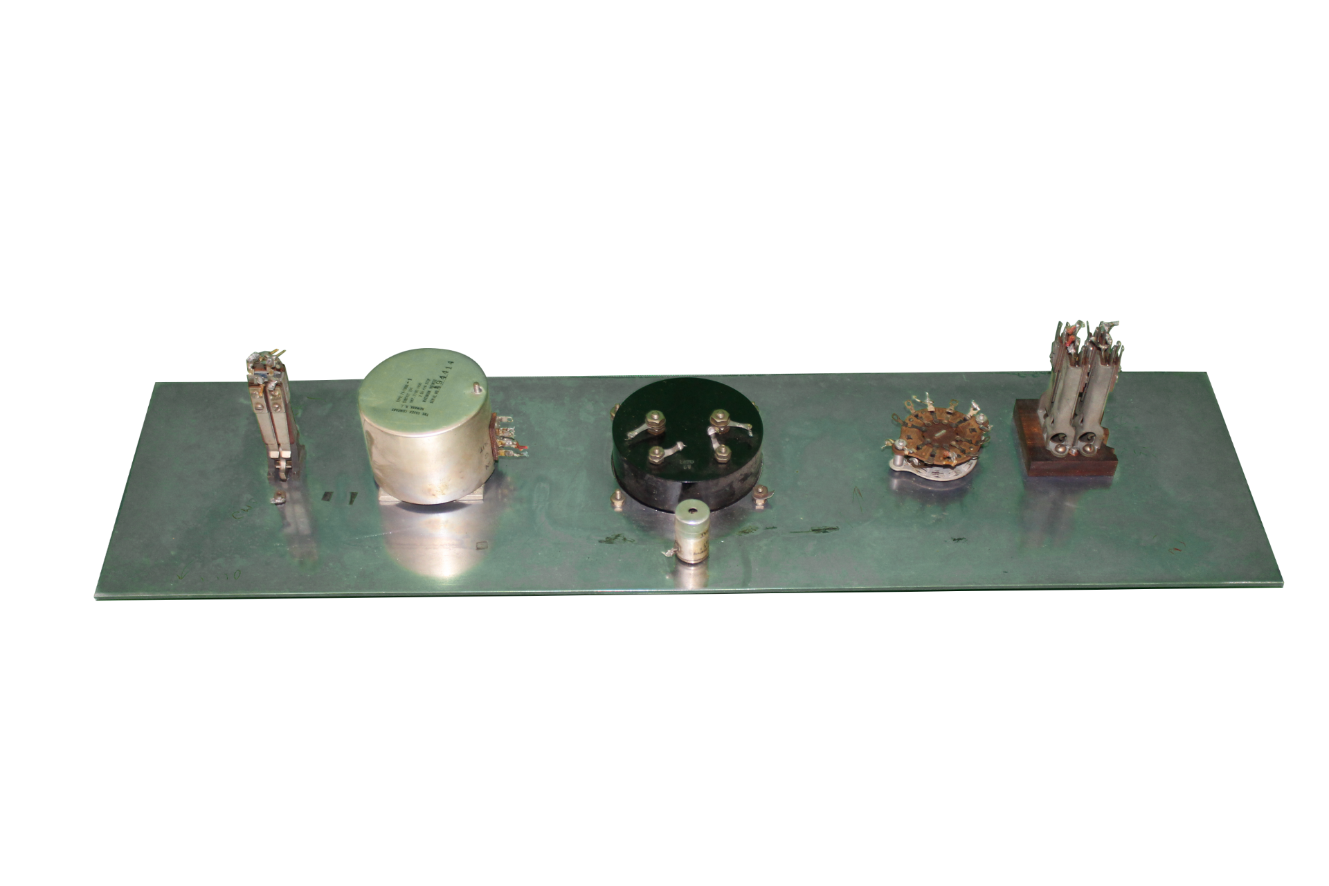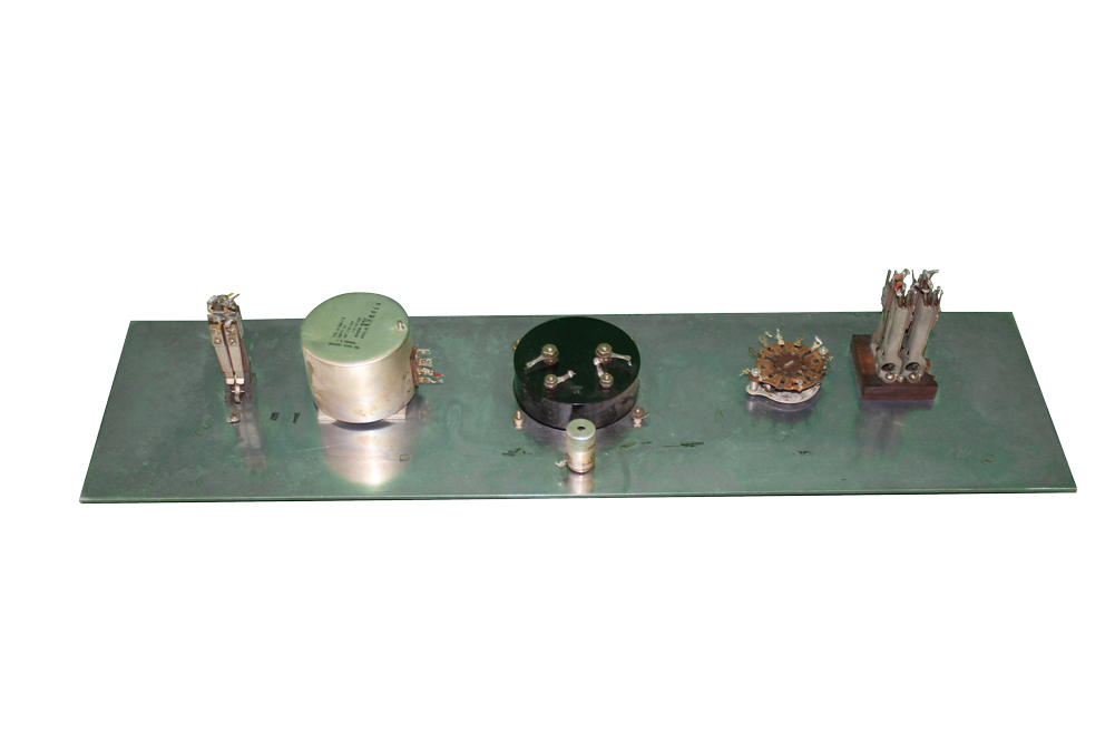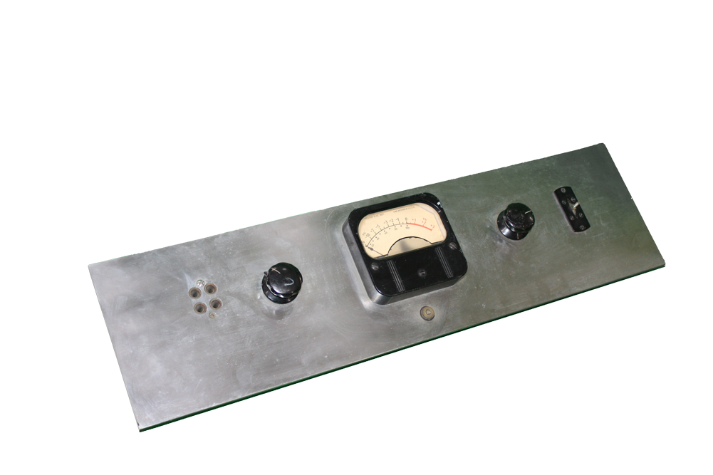 Silver, steel, rectangular electrical control panel with dials and knobs.