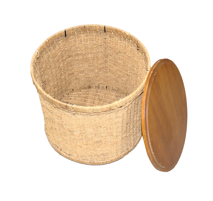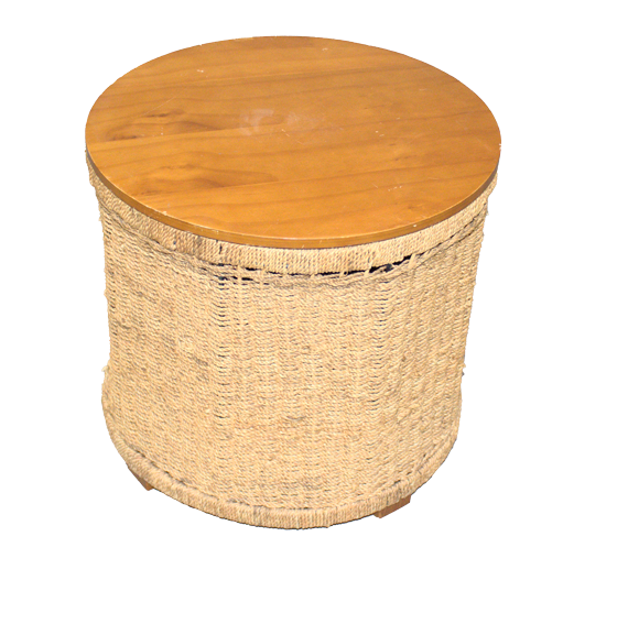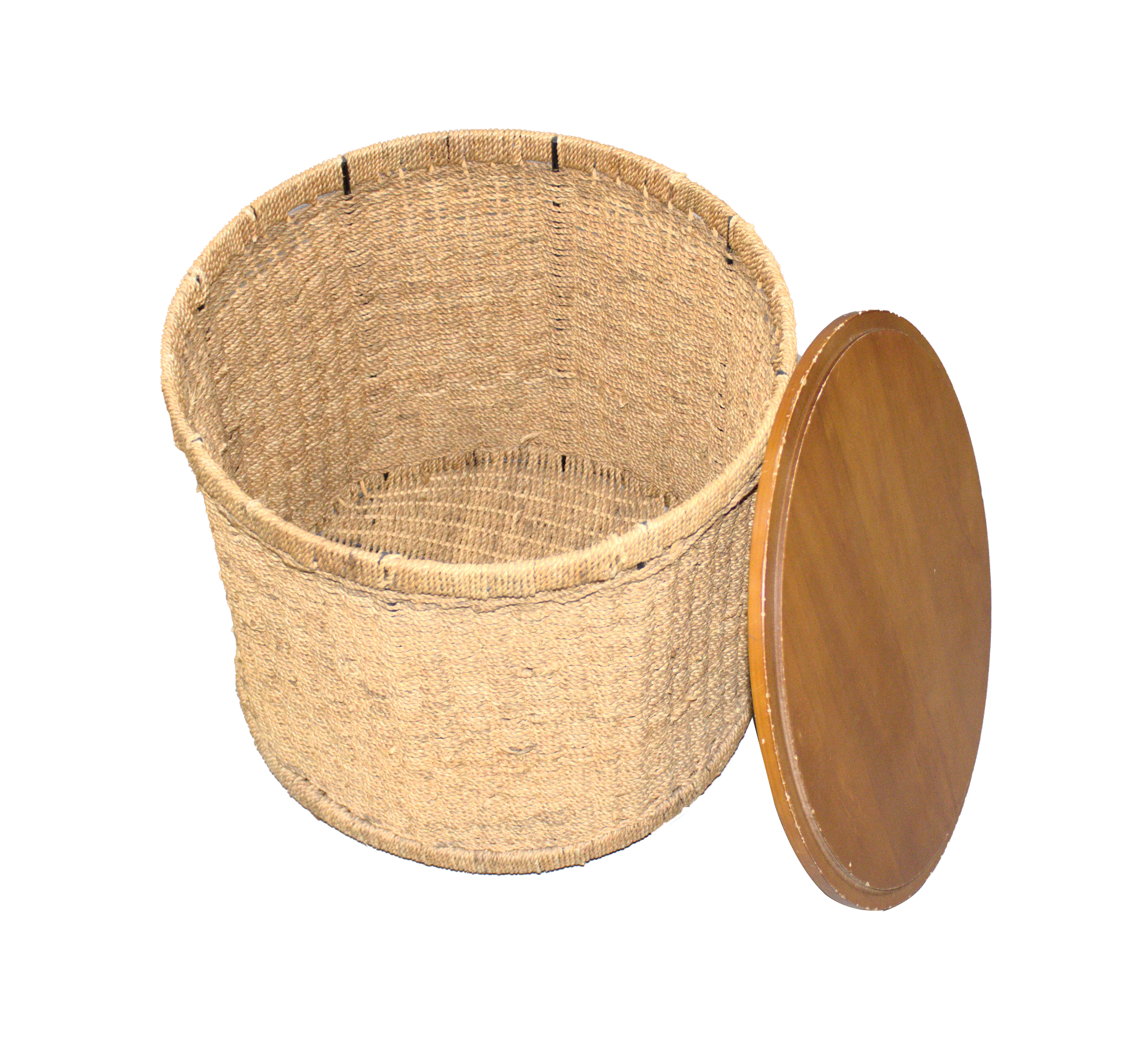 Round, woven rope, end table/storage ottoman with golden brown, wooden lid.