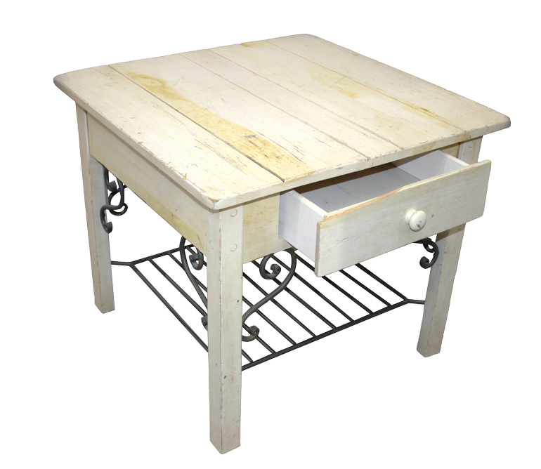 Antique white, wooden, square, end table with drawer, lower metal rack and metal scroll accents.
