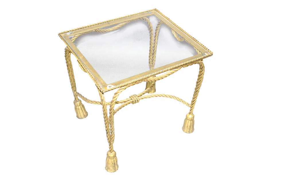 Gold, metal, rope shaped, rectangular end table with tassle feet and glass top.