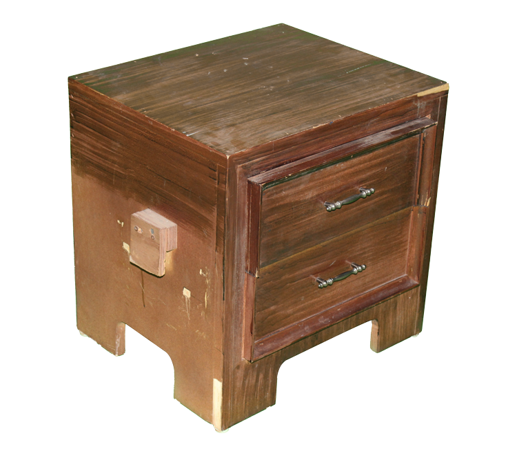 Red/brown, wooden, cube end table with top drawer, faux bottom drawer with handles, and painted wood grain.