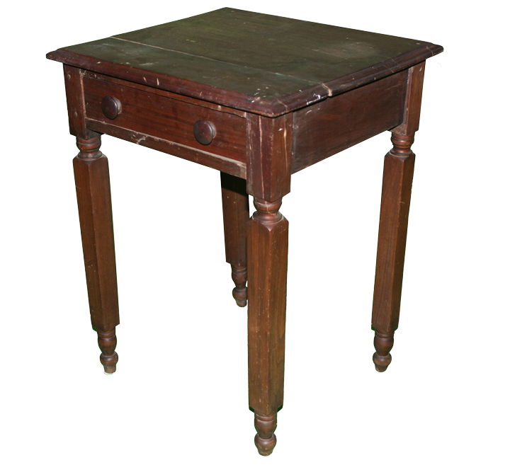 Red/brown, wooden, square end table with turned legs and single drawer with two knob handles.
