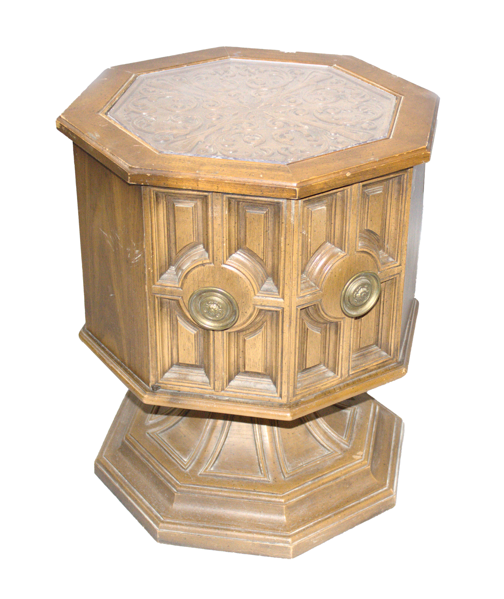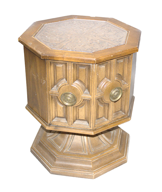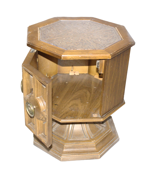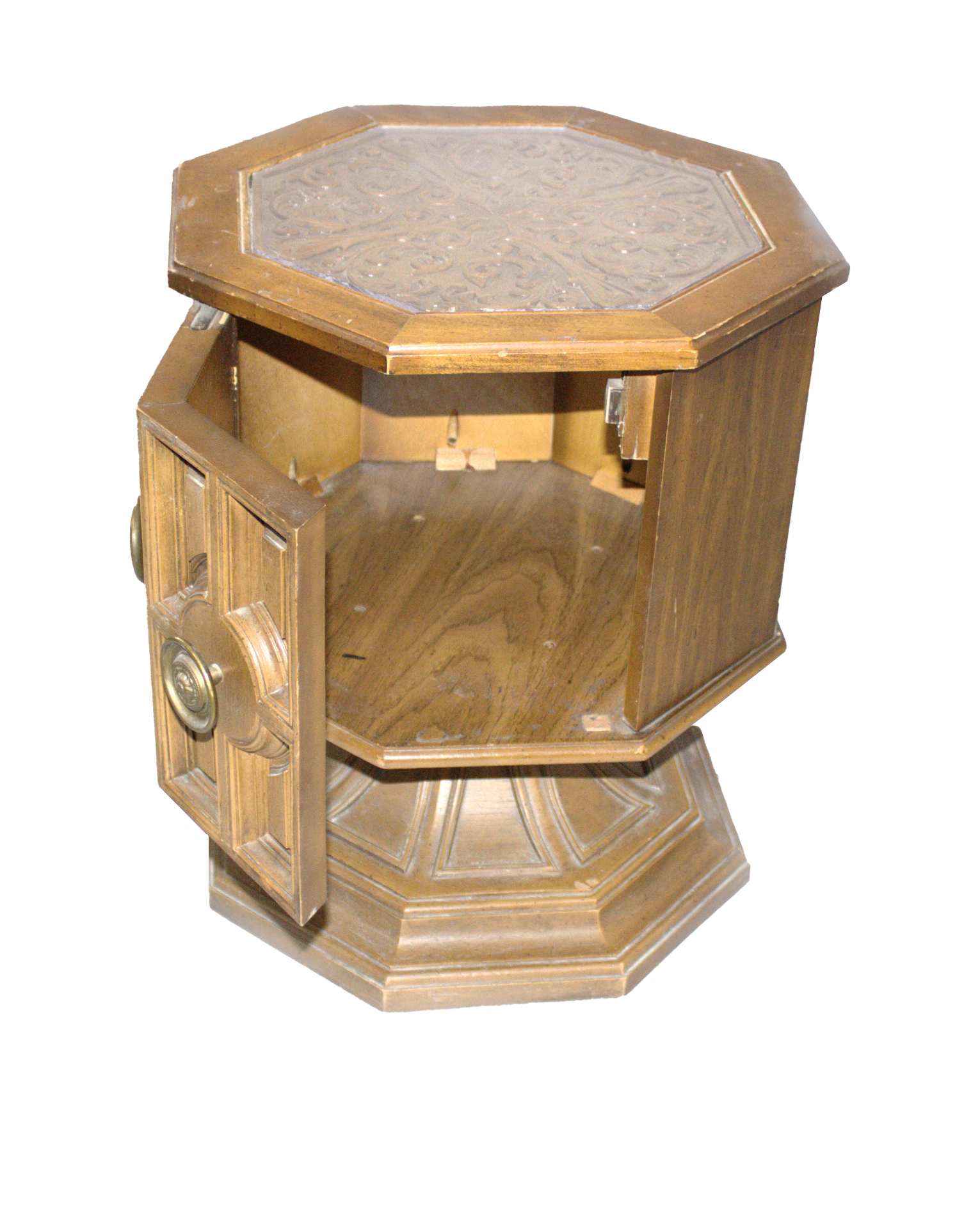 Brown, wooden and plastic, octogon end table with door, brass knobs and scrollwork design on top with clear, acrylic cover.